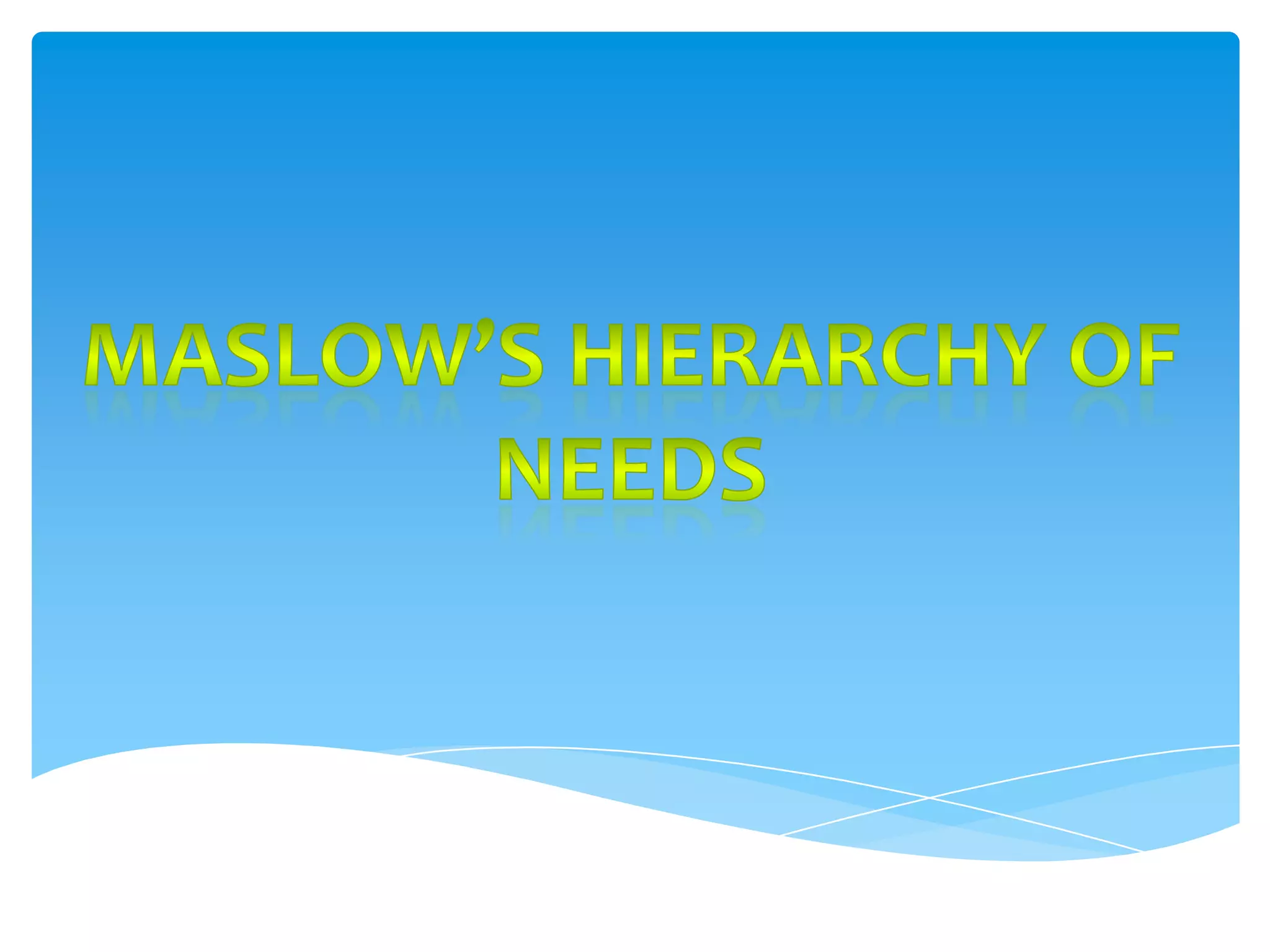 This document outlines Abraham Maslow's hierarchy of needs, which categorizes human needs into 5 levels from most basic to most advanced. The levels are: 1) physical survival needs like food and water, 2) safety and security needs, 3) social belonging needs like friendship, 4) esteem needs such as recognition and achievement, and 5) self-actualization needs involving personal growth and reaching one's full potential. Maslow believed meeting lower level needs was necessary before progressing to meet higher level needs.