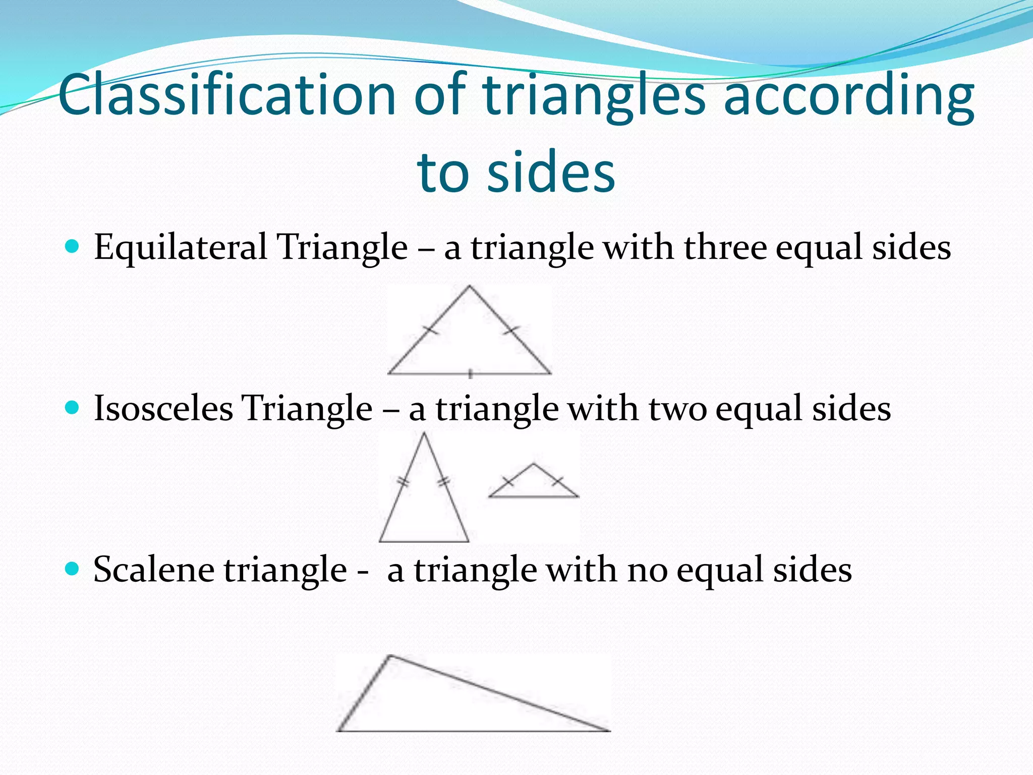 The document classifies triangles into six categories based on the lengths of their sides and size of their angles. Triangles are either equilateral with three equal sides and three 60 degree angles, isosceles with two equal sides, or scalene with no equal sides. Additionally, triangles can be right with one 90 degree angle, acute with all angles less than 90 degrees, or obtuse with one angle greater than 90 degrees. An equilateral triangle has all three angles congruent and equal sides.