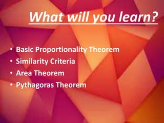 This document summarizes key concepts in geometry related to triangles. It discusses similarity criteria including AAA, SSA, and SSS. It also covers the area theorem, Pythagorean theorem, and its converse. The basic proportionality theorem and its converse are explained as well as how they relate to parallel lines. In summary, this document outlines important triangle properties and theorems for understanding similarity, area, right triangles, and parallel lines.
