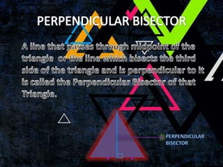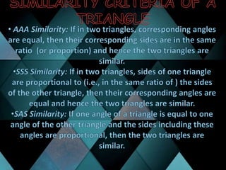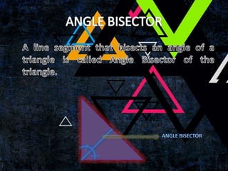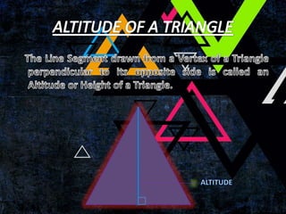 A triangle is a 3-sided polygon with three sides, three vertices, and three angles. Triangles can be categorized based on their side lengths as either equilateral (all sides equal), isosceles (two sides equal), or scalene (no sides equal). They can also be categorized based on their angle measures as either acute (all angles less than 90 degrees), obtuse (one angle greater than 90 degrees), or right (one angle of 90 degrees). The study of triangles, known as triangle geometry, contains many beautiful theorems and relationships.