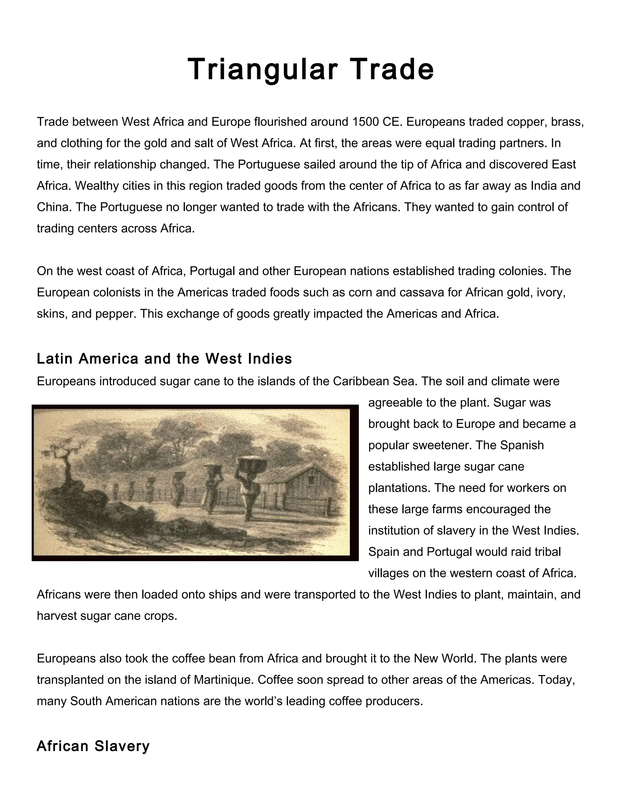 The triangular trade route involved the exchange of goods between three regions - Europe, West Africa, and the Americas. Europeans traded manufactured goods for enslaved Africans, who were then transported to the Americas to work on plantations. The goods produced in the Americas, like sugar and coffee, were brought back to Europe to complete the triangle. Africans replaced Native Americans as enslaved laborers as European diseases had decimated Native American populations. South America is now a leading producer of coffee.