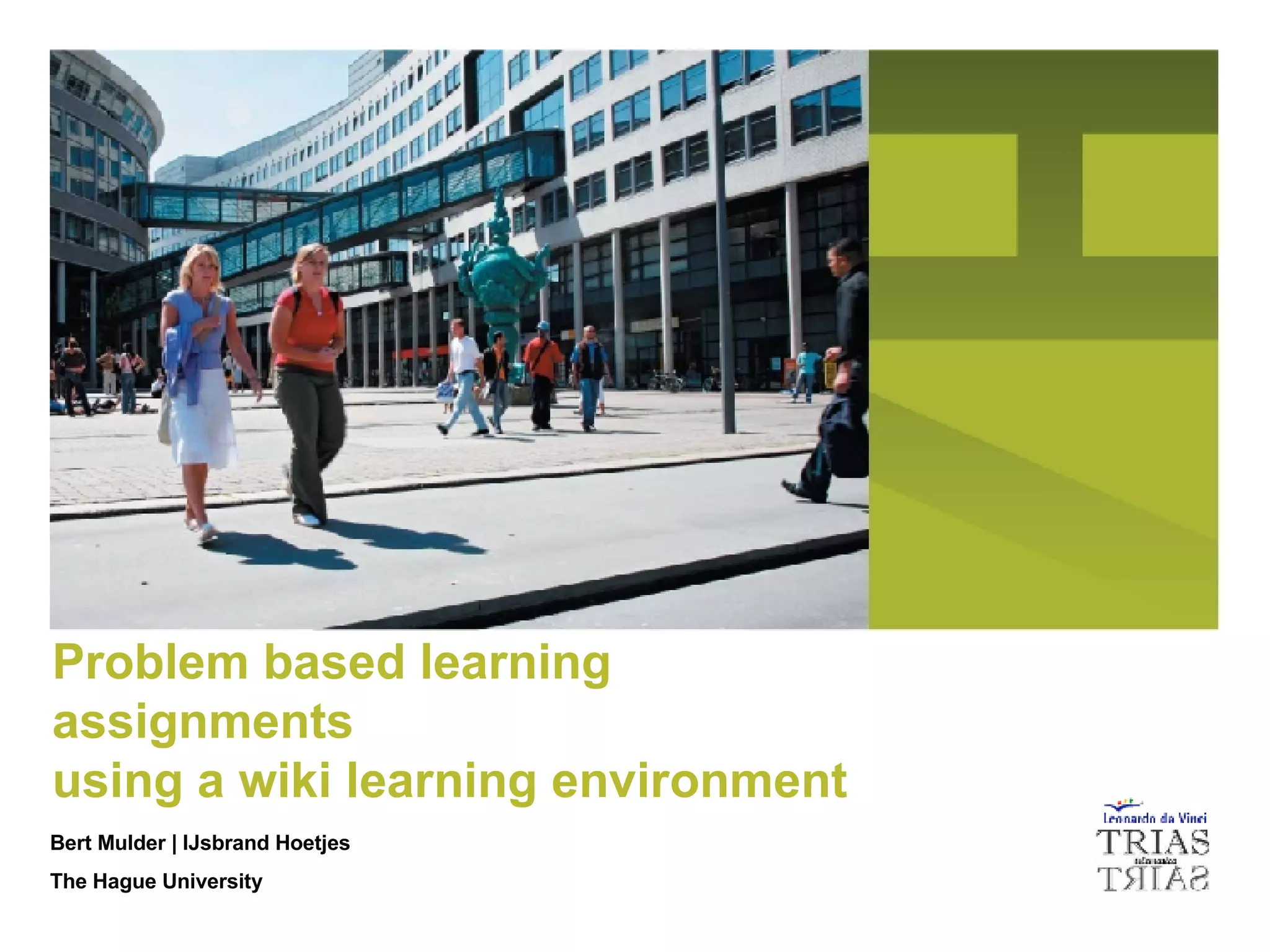 This document discusses using problem-based learning (PBL) assignments with a wiki learning environment. It outlines the 7 steps of the PBL process: 1) clarifying terms, 2) formulating problem statements, 3) analyzing problems, 4) inventorying problems and solutions, 5) formulating self-study objectives, 6) individual self-study, and 7) concluding by synthesizing findings. An example assignment is provided where students work through the PBL steps in groups to study a topic, form learning questions, conduct self-study, and reach a conclusion.