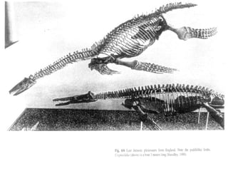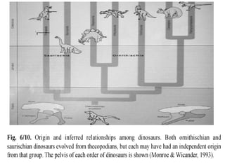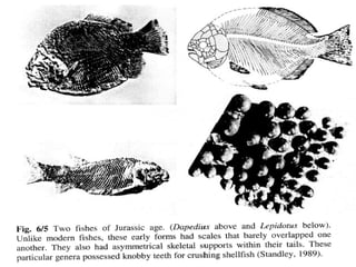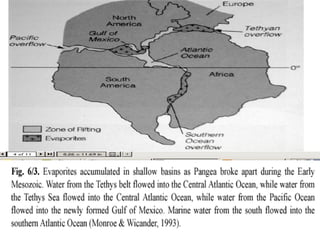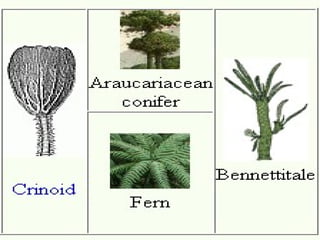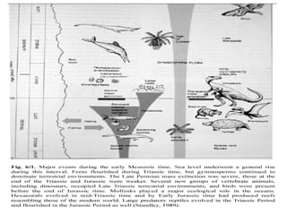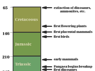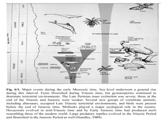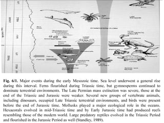The Mesozoic Era, spanning from 248 to 65 million years ago, is divided into three periods: Triassic, Jurassic, and Cretaceous, marking significant changes in life forms and vegetation from the preceding Paleozoic Era. Dinosaurs and the first mammals appeared during this era, with dinosaurs evolving in the Triassic and proliferating in the Jurassic before their extinction at the end of the Cretaceous. The period is characterized by the diversification of gymnosperms and the emergence of angiosperms, alongside geological transformations driven by the breakup of the supercontinent Pangaea.