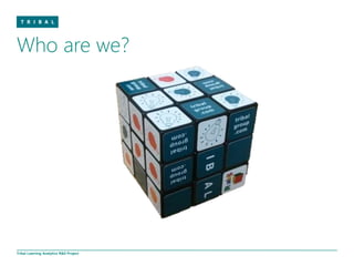 This document discusses Tribal's learning analytics R&D project. It notes that higher education institutions now have access to large amounts of student data but more work is needed to define student success and develop predictive models. The project aims to build models that identify students in need of support, compare students to their peers, and provide insights to help staff steer students towards success. Visualizations of predictions will supplement model output with activity data to inform staff discussions.