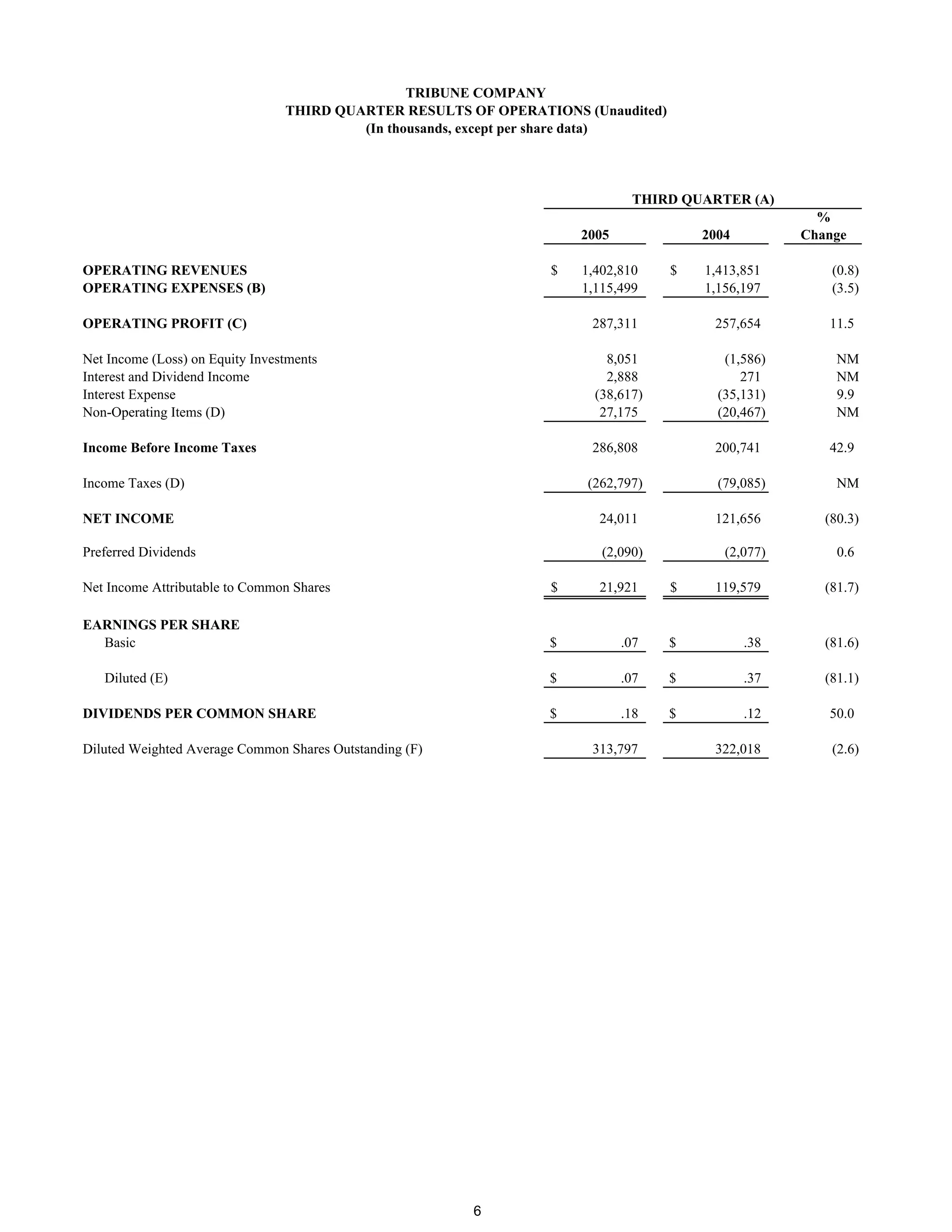 The document summarizes Tribune Company's financial results for the third quarter and first three quarters of 2005 compared to the same periods in 2004. Key points: - Operating revenues and operating profit increased in the third quarter of 2005 but decreased for the first three quarters compared to the prior year. - Net income decreased significantly for the third quarter but increased for the first three quarters of 2005 versus 2004. - Earnings per share decreased substantially for the third quarter but increased for the first three quarters compared to the previous year.