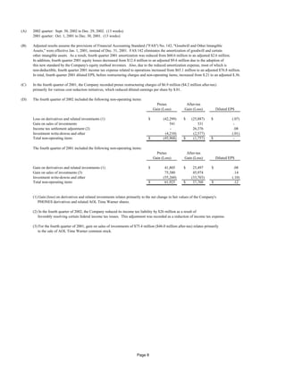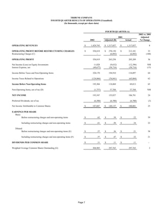 Tribune Company reported its fourth quarter and full year 2002 results. For the fourth quarter, revenues increased 8% year-over-year and net income increased 24%. Operating profit before restructuring charges increased 33% due to cost reductions. For the full year, revenues increased 2% and net income increased 43% due to restructuring initiatives and asset sales. Earnings per share increased 22% in the fourth quarter and 45% for the full year, reflecting continued improvement.