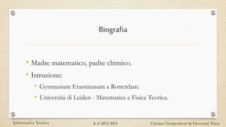 Edsger Dijkstra, nato a Rotterdam nel 1930 e scomparso nel 2002, è stato un pioniere della programmazione e dell'informatica teorica, noto per il suo lavoro sui algoritmi, in particolare l'algoritmo di Dijkstra per i cammini minimi nei grafi. Ha contribuito allo sviluppo di vari computer e linguaggi di programmazione, enfatizzando la chiarezza e l'eleganza nel codice. La sua influenza si estende a aree come la programmazione ricorsiva, la gestione della memoria tramite stack e il concetto di semafori nella programmazione concorrente.