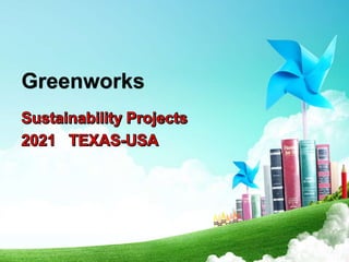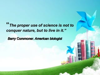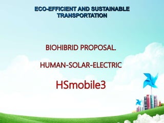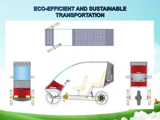 The document discusses sustainability and neuroarchitecture's approach to solving five areas of sustainability: energy, environment, water, health, and food. It does this through self-sufficient and bioclimatic houses that generate their own energy and improve efficiency. The houses also have green roofs that improve insulation and air quality while using ecological materials. Gardens in the houses provide healthy food and the design aims to manage waste and water treatment for health and the biosphere while promoting well-being. Specific examples discussed include a solar car from Germany and a solar-powered tri-cycle from the US.