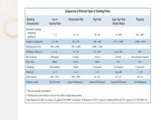 This document discusses different types of trickling filters classified by organic and hydraulic loadings or by the number of units used in series. Trickling filters are classified as low rate, high rate, intermediate rate, or roughing filters depending on loadings. They can also be single stage or double stage depending on the number of units used. Low rate trickling filters typically produce consistent effluent quality with varying influent. High rate trickling filters use recirculation to increase hydraulic loading and improve sloughing. Roughing filters are high rate filters that require low energy for treating high strength wastewater.
