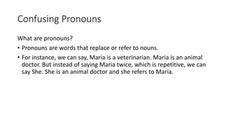The document discusses various confusing grammar concepts including pronouns, adjectives vs adverbs, nouns vs verbs, and prepositions. It provides examples of commonly confused word pairs and explains the differences and proper usage of each term. Key points covered include the differences between pronouns like I/me and possessive pronouns, adjectives like dead/deadly, verbs like lie/lay, and prepositions like on/in. The document aims to clarify these commonly mixed up grammar concepts through detailed explanations and examples.