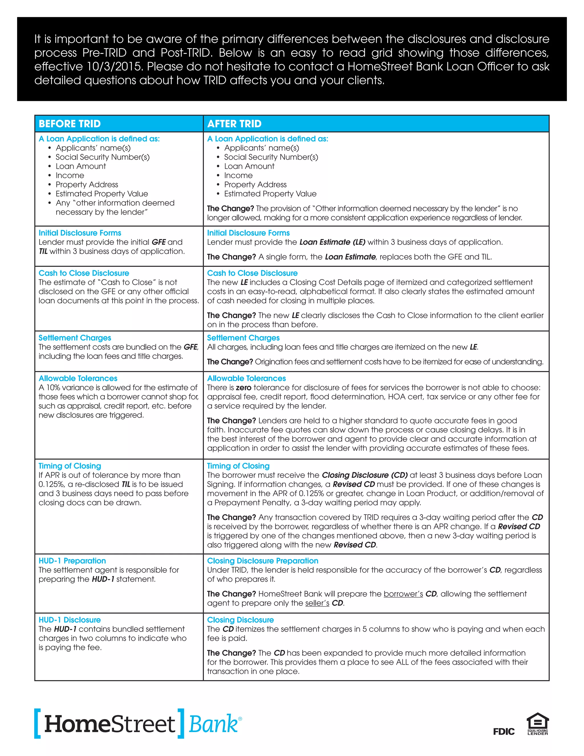 The document summarizes the key differences between mortgage disclosure processes before and after the TILA-RESPA Integrated Disclosure (TRID) rule went into effect on October 3, 2015. Some of the main changes include a single Loan Estimate form replacing multiple earlier forms, more transparent disclosure of closing costs and cash needed to close earlier in the process, and lenders taking responsibility for accuracy of disclosures instead of settlement agents. The new rules aim to provide borrowers clearer and more consistent information throughout the mortgage process.