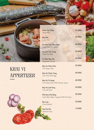 Tài liệu trình bày thực đơn của một nhà hàng với nhiều món ăn bao gồm khai vị, món chính và món tráng miệng. Các món ăn thường bao gồm hải sản, thịt gia cầm, thịt lợn và nhiều loại rau củ, với giá niêm yết cho từng món. Ngoài ra, tài liệu cũng đề cập đến các món ăn đặc sản địa phương và một số món ăn hấp dẫn khác.