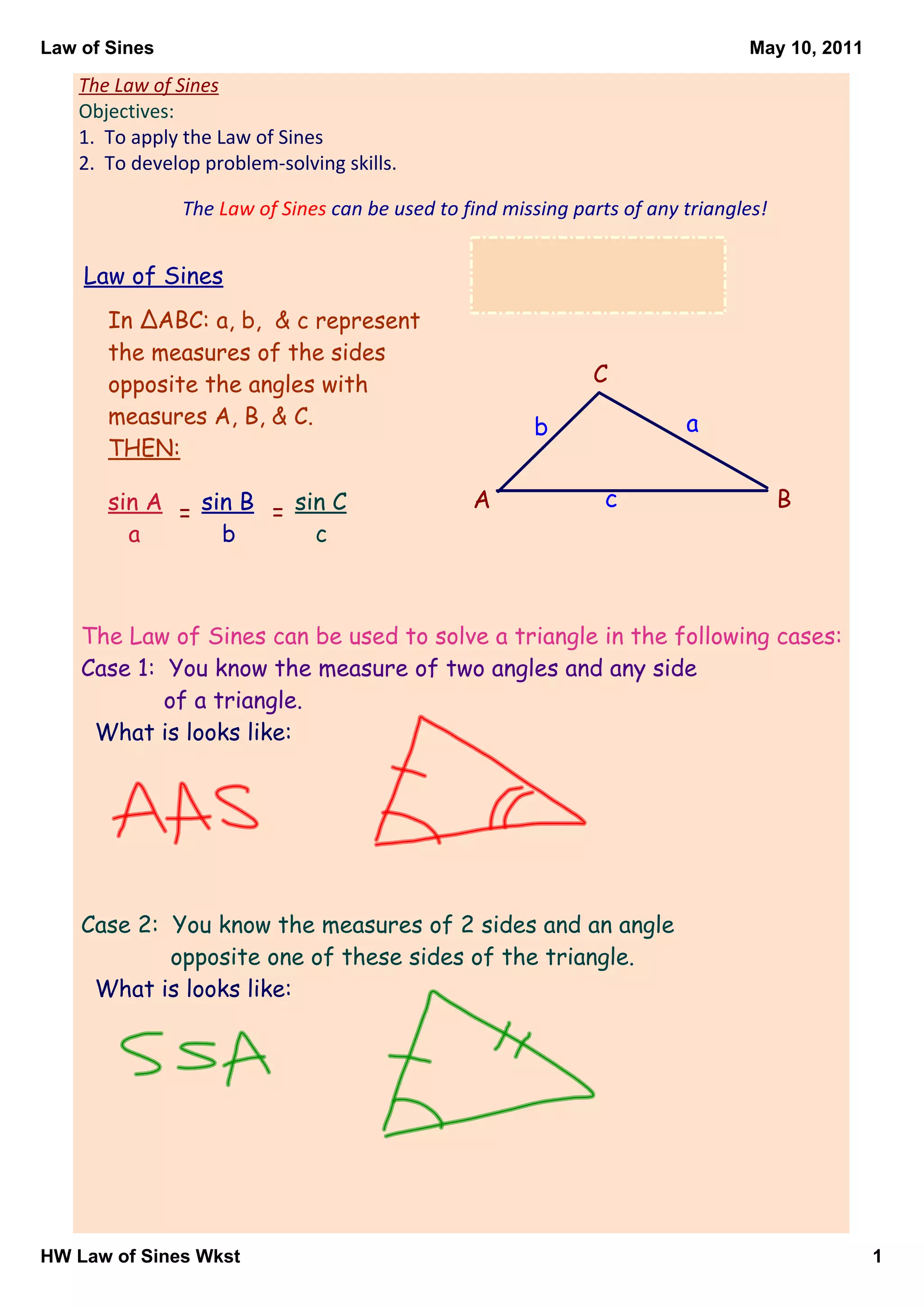 The document discusses the Law of Sines, which can be used to find missing parts of any triangle. It provides two cases where the Law of Sines can be used: 1) when two angles and any side are known, and 2) when two sides and the angle between them are known. It then gives examples of using the Law of Sines to find specific values like side lengths and triangle areas.