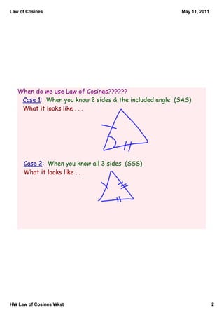 The document discusses the Law of Cosines, which is an equation used to solve for unknown sides and angles of triangles when certain information is known. It states that the Law of Cosines can be used when two sides and the included angle are known (SAS) or when all three sides are known (SSS). It then provides two examples of using the Law of Cosines to solve for a missing side length or angle measure.