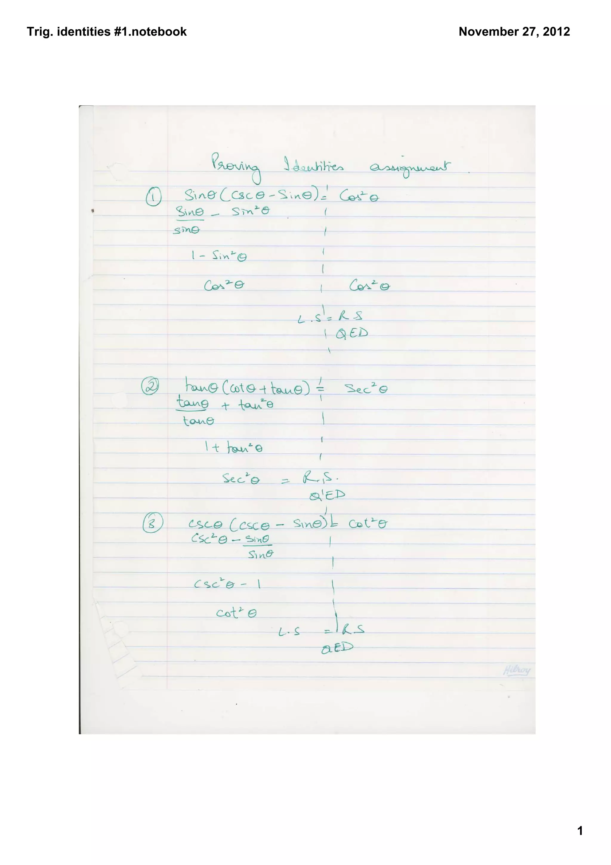 The document is a notebook on trigonometric identities from November 27, 2012. It covers over 25 pages and explores over a dozen important trig identities including the sum, difference, double-angle, and half-angle formulas as well as identities involving trig functions of multiples of an angle. Examples are provided to demonstrate how to use the identities to simplify trigonometric expressions.