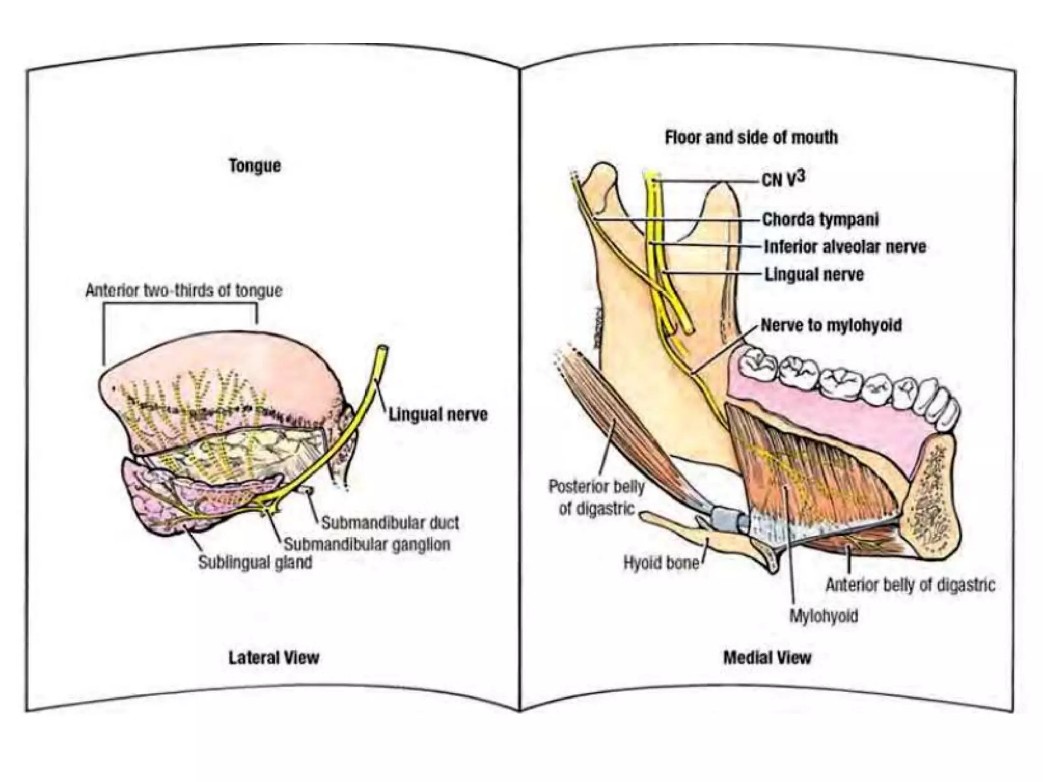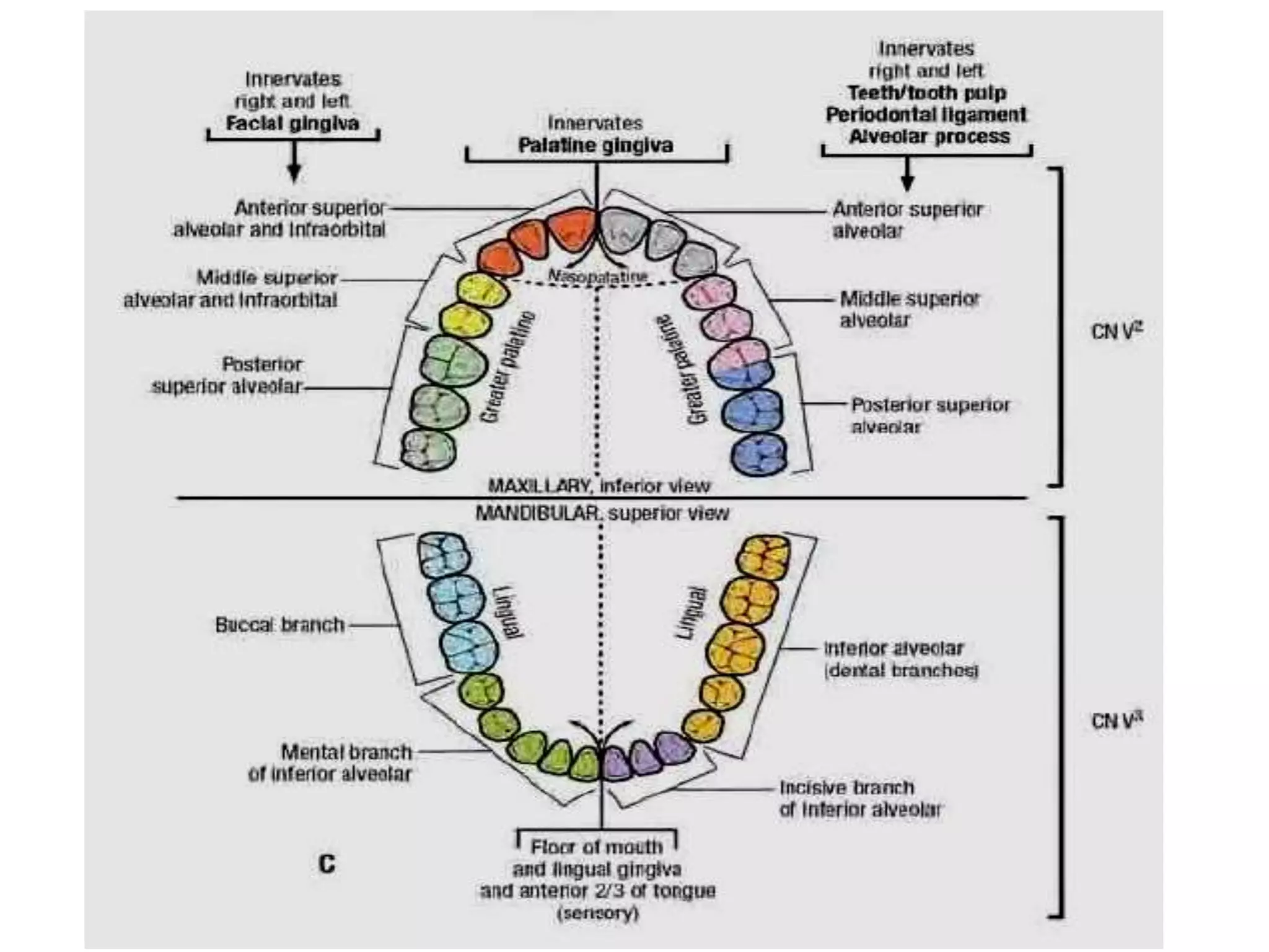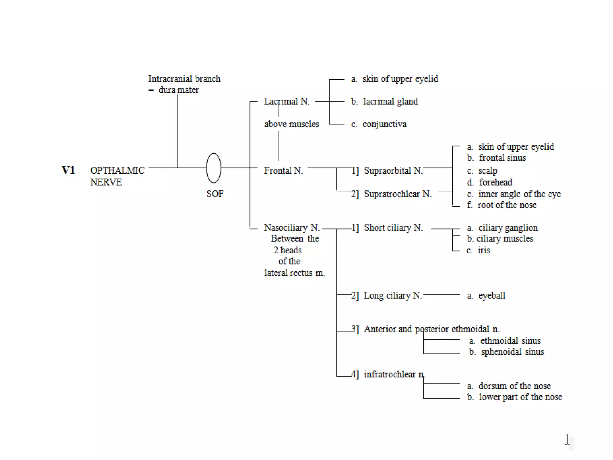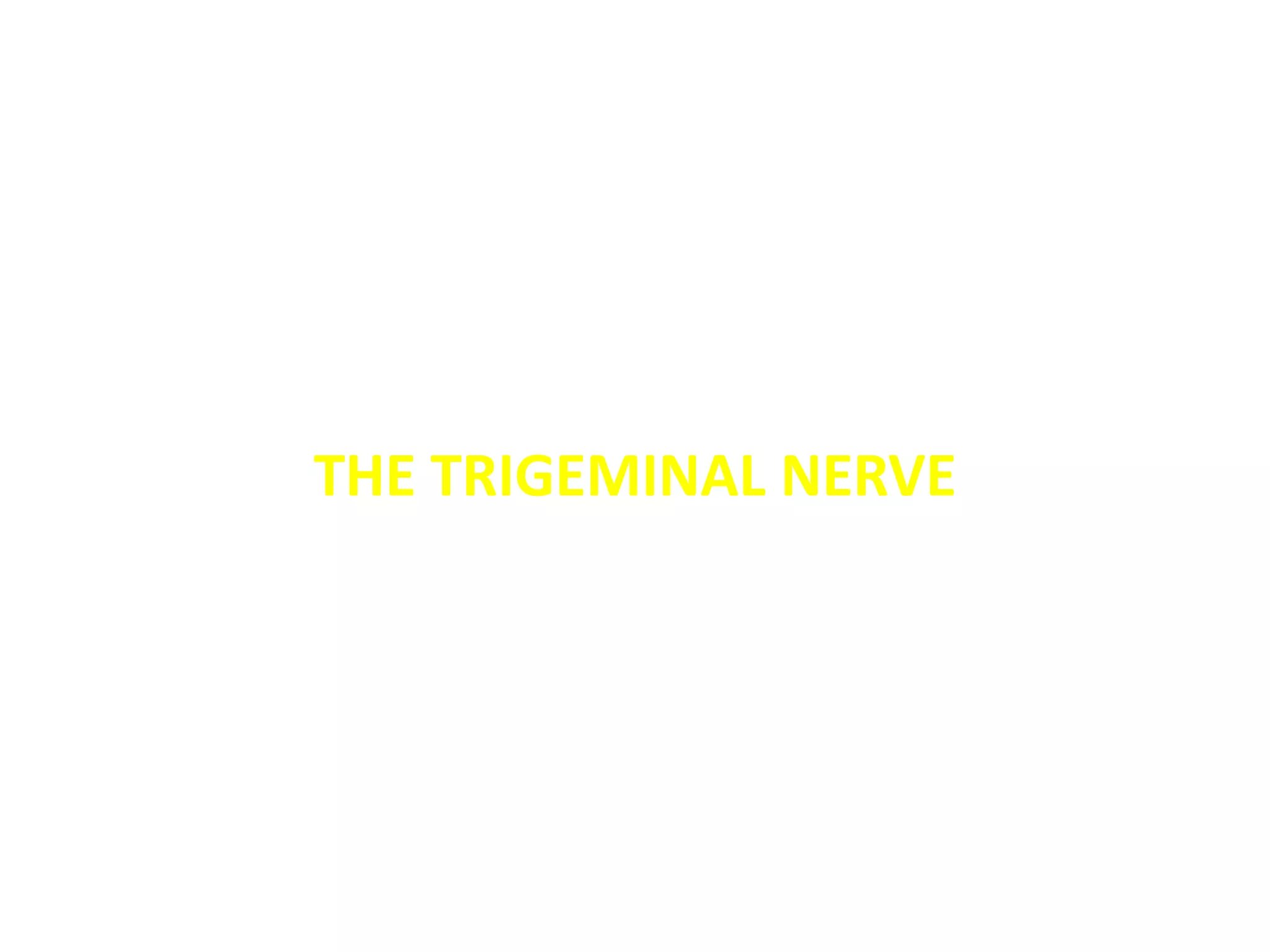 The trigeminal nerve arises from the pons and has three main divisions - the ophthalmic, maxillary, and mandibular nerves. The ophthalmic nerve is sensory to the eye and parts of the nose and forehead. The maxillary nerve is sensory to parts of the face and upper teeth. The mandibular nerve is mixed sensory and motor, innervating the lower face, teeth, and muscles of mastication. It exits through the foramen ovale. The document then describes the branches and distributions of each trigeminal nerve division.