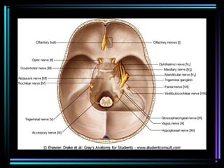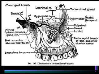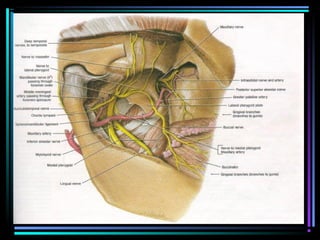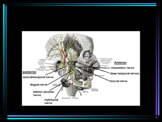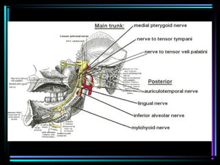 The trigeminal nerve is the 5th cranial nerve and is a mixed nerve responsible for sensation in the face and motor function of muscles of mastication. It has 3 main divisions - the ophthalmic, maxillary, and mandibular nerves. The mandibular nerve is the largest division and supplies motor innervation to the muscles of mastication as well as sensory innervation to parts of the face and scalp.
