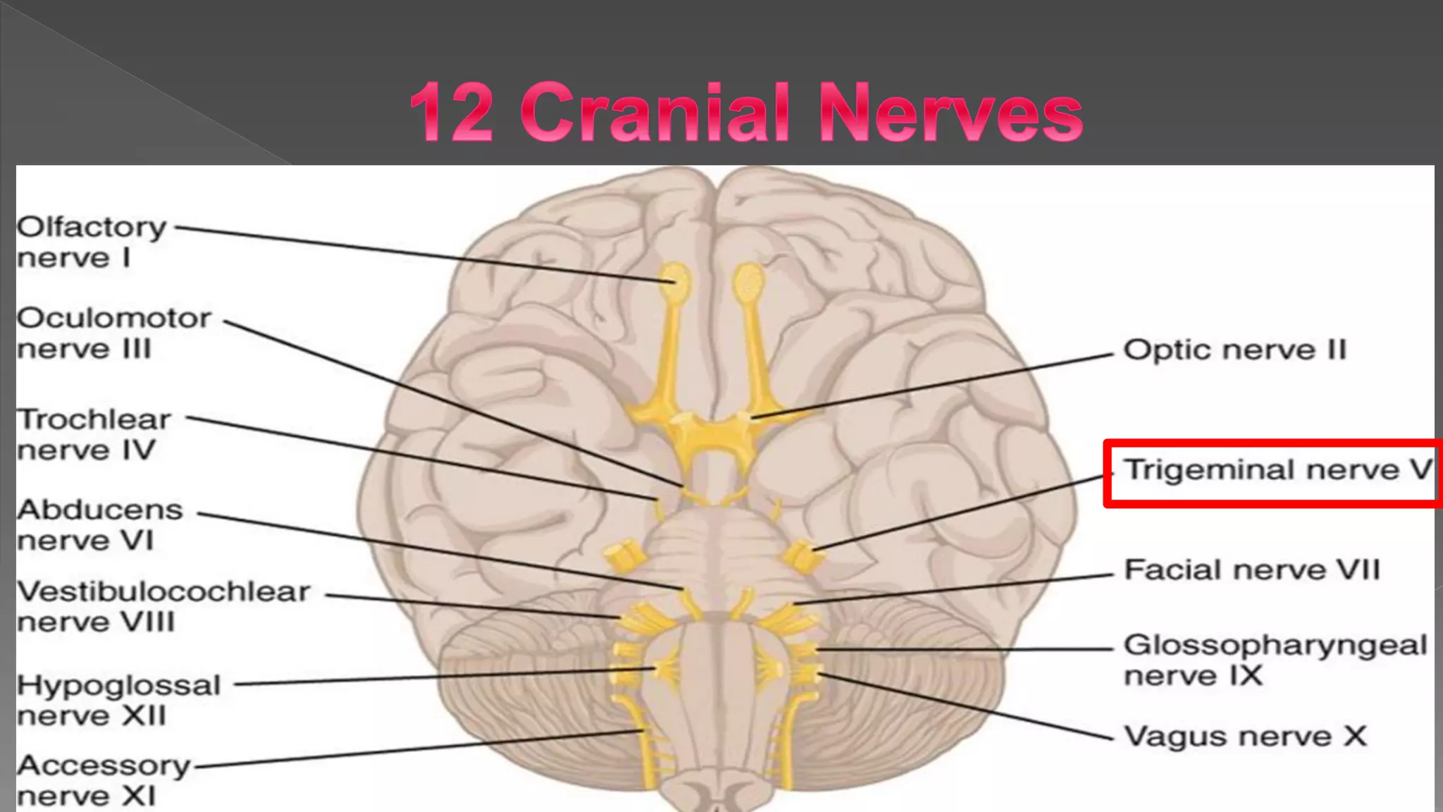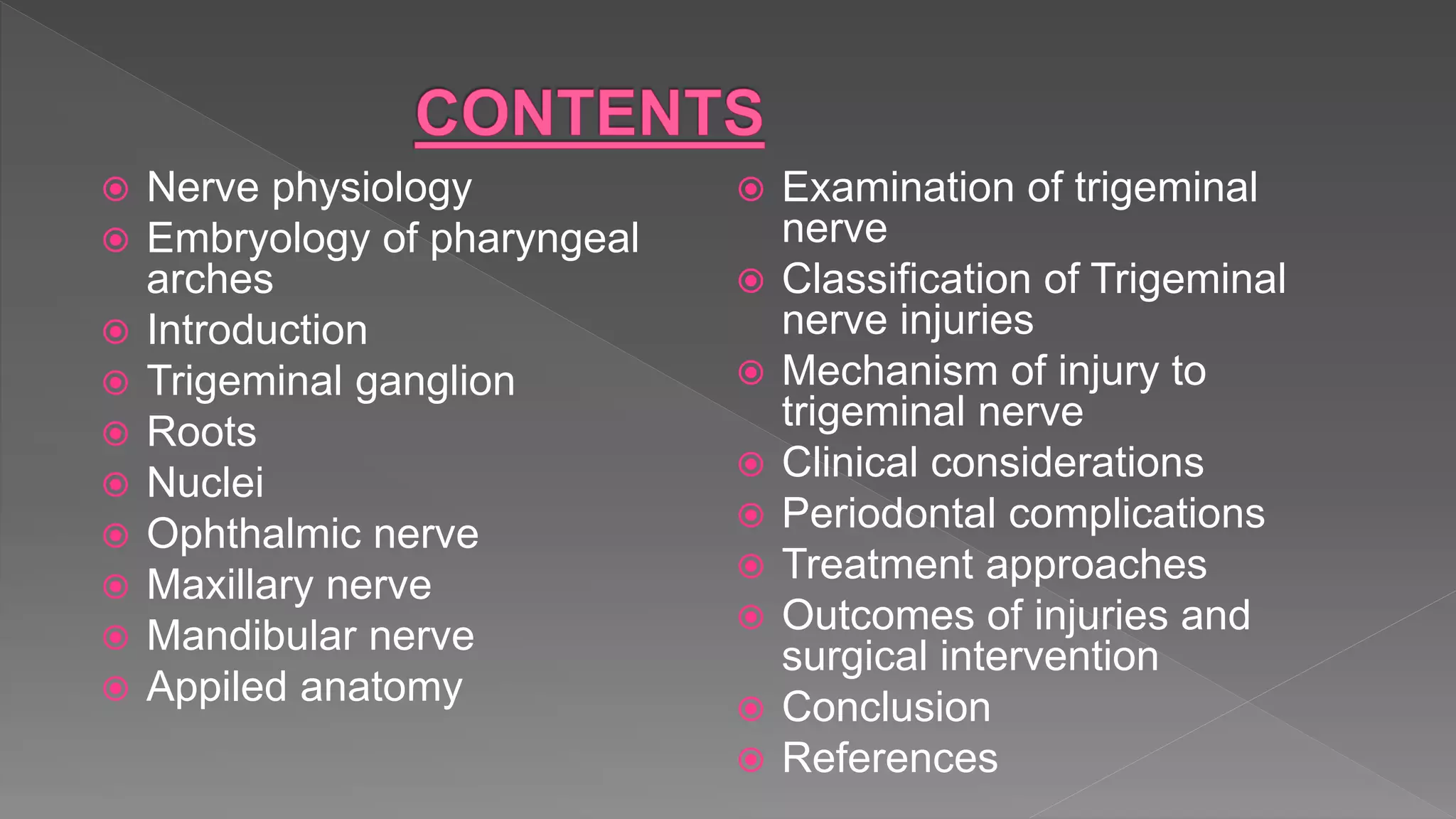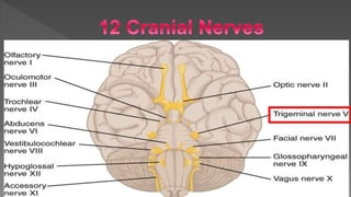 This document summarizes the trigeminal nerve, including its embryology, anatomy, branches, functions and clinical considerations. It begins with the embryology of the pharyngeal arches and how they relate to nerve development. It then describes the trigeminal ganglion, roots and nuclei. The three divisions of the trigeminal nerve and their branches are outlined. Clinical tests for examining the trigeminal nerve and classifying injuries are summarized. Common causes of trigeminal nerve injuries and their treatment approaches are briefly discussed.