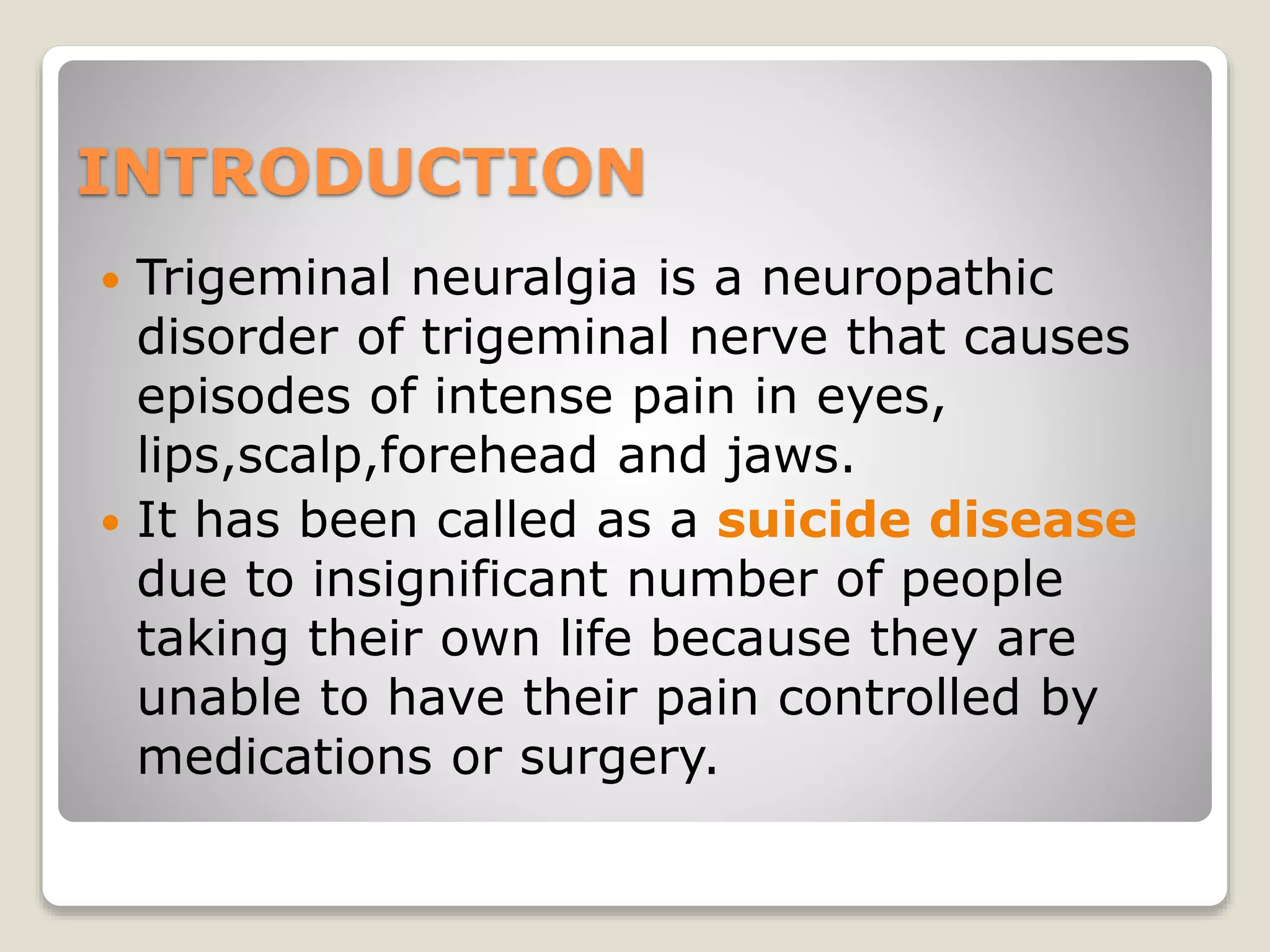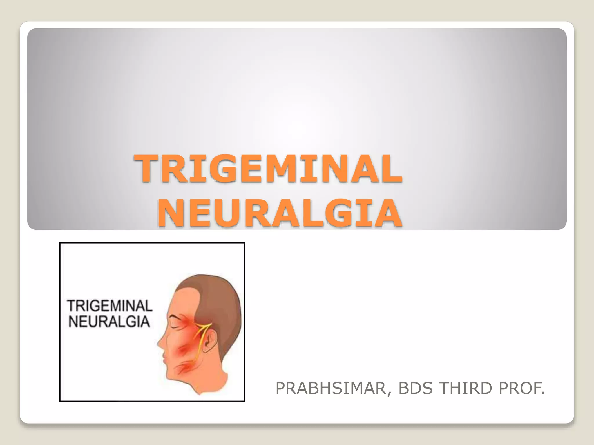 Trigeminal neuralgia is a neuropathic disorder causing episodes of intense pain in the face. It is characterized by brief, severe electric shock-like pains triggered by mundane stimuli like washing or talking. It is caused by a blood vessel compressing the trigeminal nerve root. Treatments include carbamazepine and other anticonvulsants as first-line medical options or microvascular decompression surgery to relieve nerve compression.