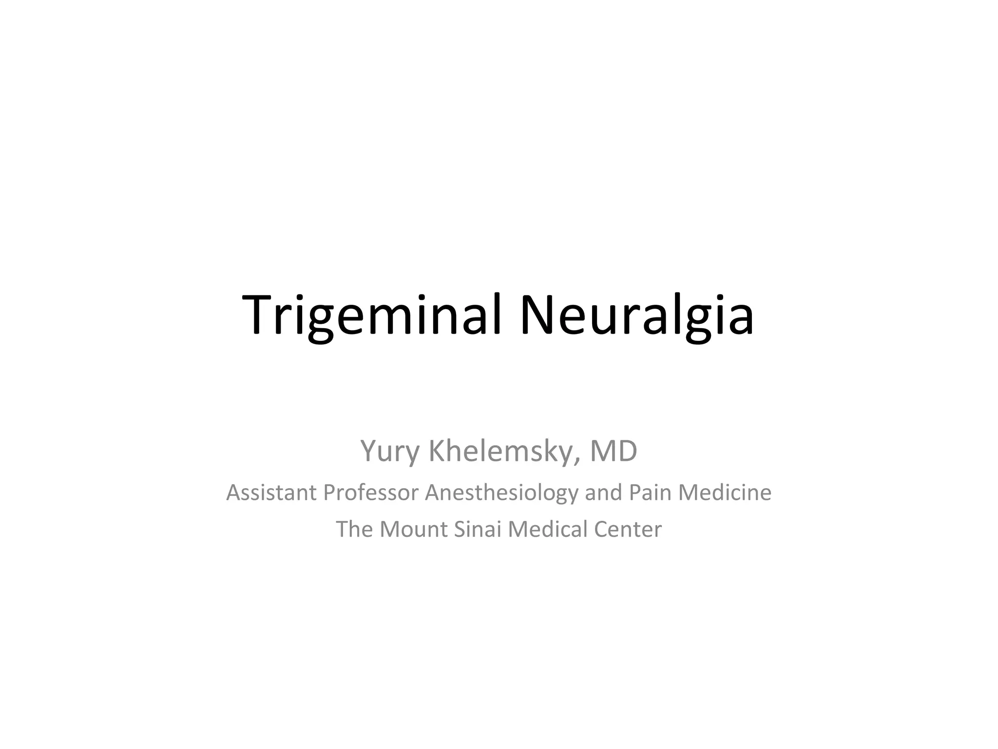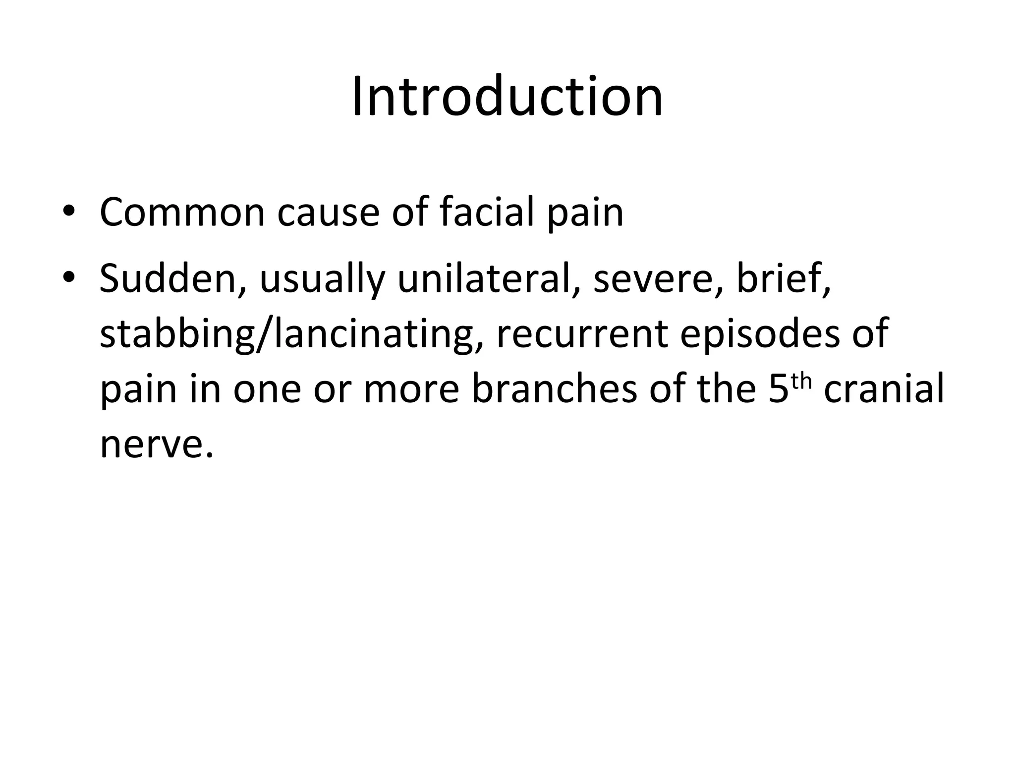 Trigeminal neuralgia is a neuropathic disorder characterized by severe, sporadic facial pain. It is caused most commonly by vascular compression of the trigeminal nerve near the brainstem. Carbamazepine is first-line medical treatment but has side effects. Interventional treatments include microvascular decompression, rhizotomy, and gamma knife radiosurgery which provide initial pain relief in the majority but have risks of sensory deficits. Treatment is aimed at pain control and improving quality of life.