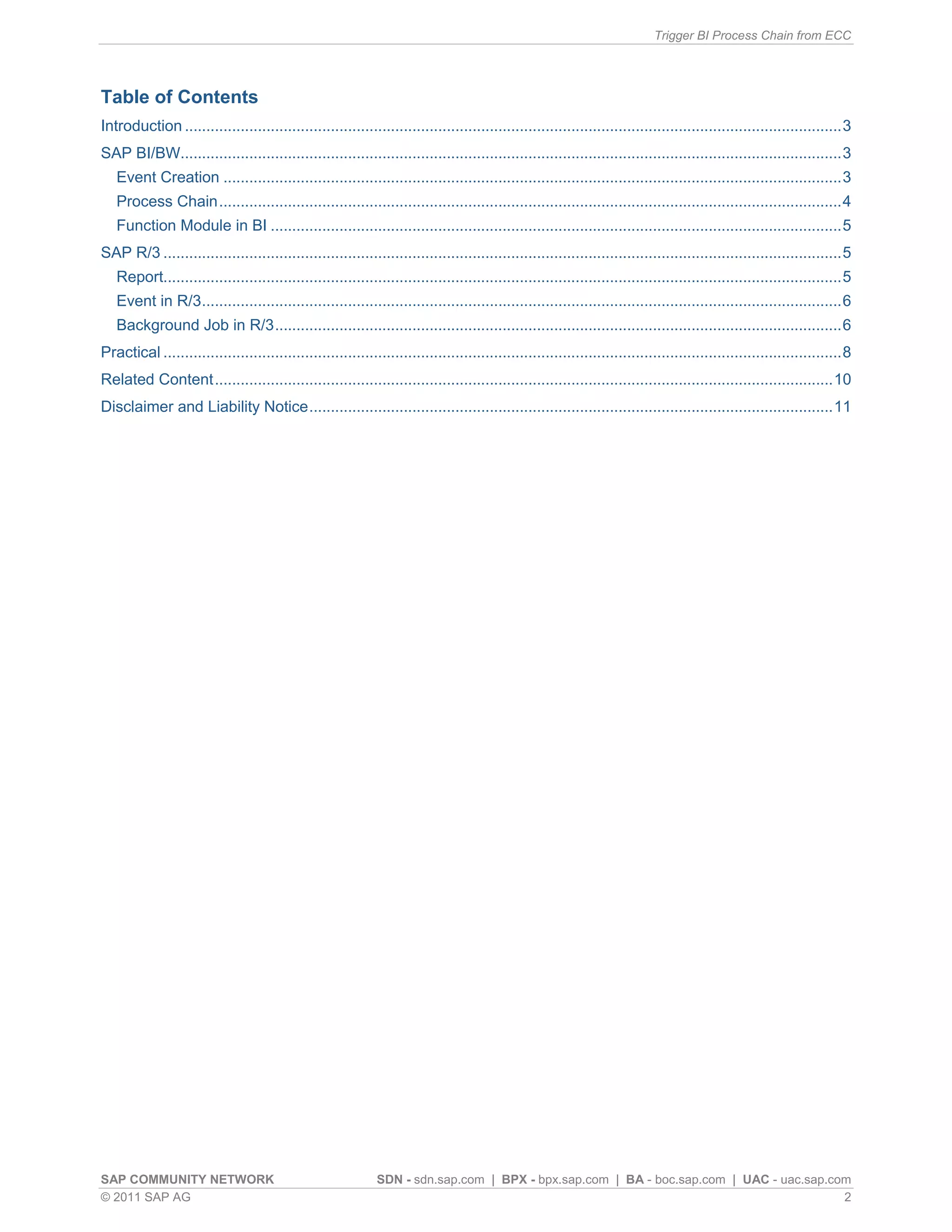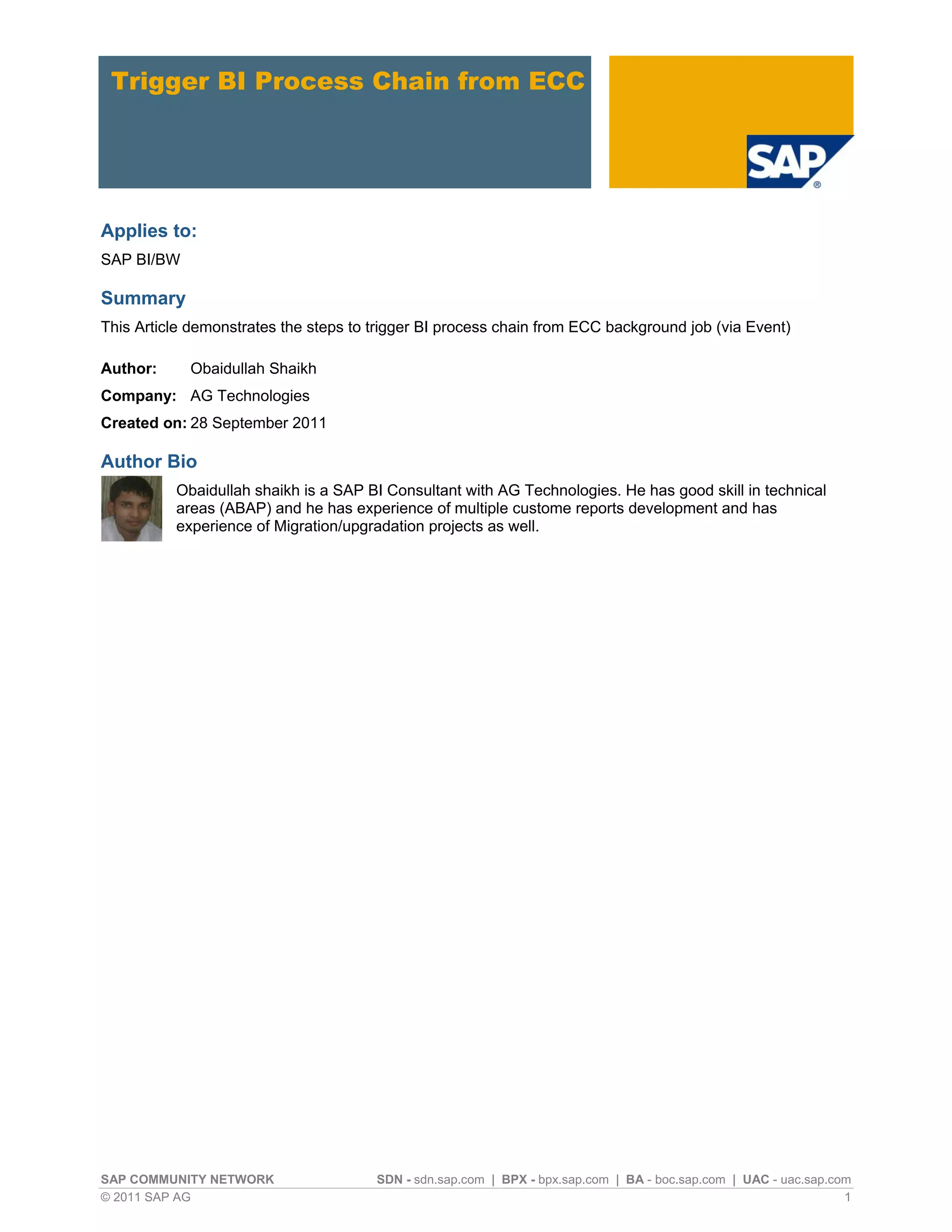This document demonstrates how to trigger a BI process chain from an ECC background job by creating an event. It involves creating an event and process chain in BI, a function module in BI that calls a standard event triggering FM, a report program in ECC that calls the BI FM, an event and background job in ECC configured to run the report program when the event occurs. When the event is triggered in ECC, it will call the BI FM which triggers the event in BI, launching the process chain.