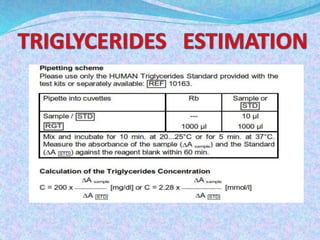 The triglyceride level test measures the amount of triglycerides in the blood. Triglycerides are a type of fat that provides energy and high levels can increase the risk of heart disease. The test is ordered to determine heart disease risk, estimate LDL cholesterol, check for pancreas inflammation, and assess risk of atherosclerosis. Doctors recommend getting tested every 5 years as part of a regular checkup, more often if being treated for high triglycerides or if diabetic. Elevated levels may be due to lifestyle factors like smoking or diet, or medical conditions like diabetes, and can be controlled through diet and exercise changes.