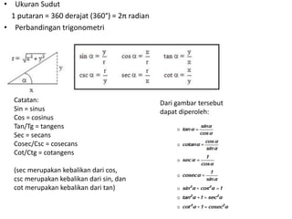 Dokumen ini membahas tentang trigonometri, termasuk ukuran sudut, perbandingan trigonometri, aturan sinus dan cosinus, serta grafik fungsi trigonometri. Selain itu, terdapat penjelasan mengenai sudut istimewa, identitas trigonometri, dan rumus-rumus terkait segitiga. Dokumen ini memberikan contoh soal dan cara menggambar grafik fungsi trigonometri.