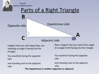 The document discusses trigonometric ratios and right triangles. It defines trigonometric ratios like sine, cosine, and tangent using the sides of a right triangle. It also describes two special right triangles - the 30-60-90 triangle and the 45-45-90 triangle - that are used often in trigonometry.