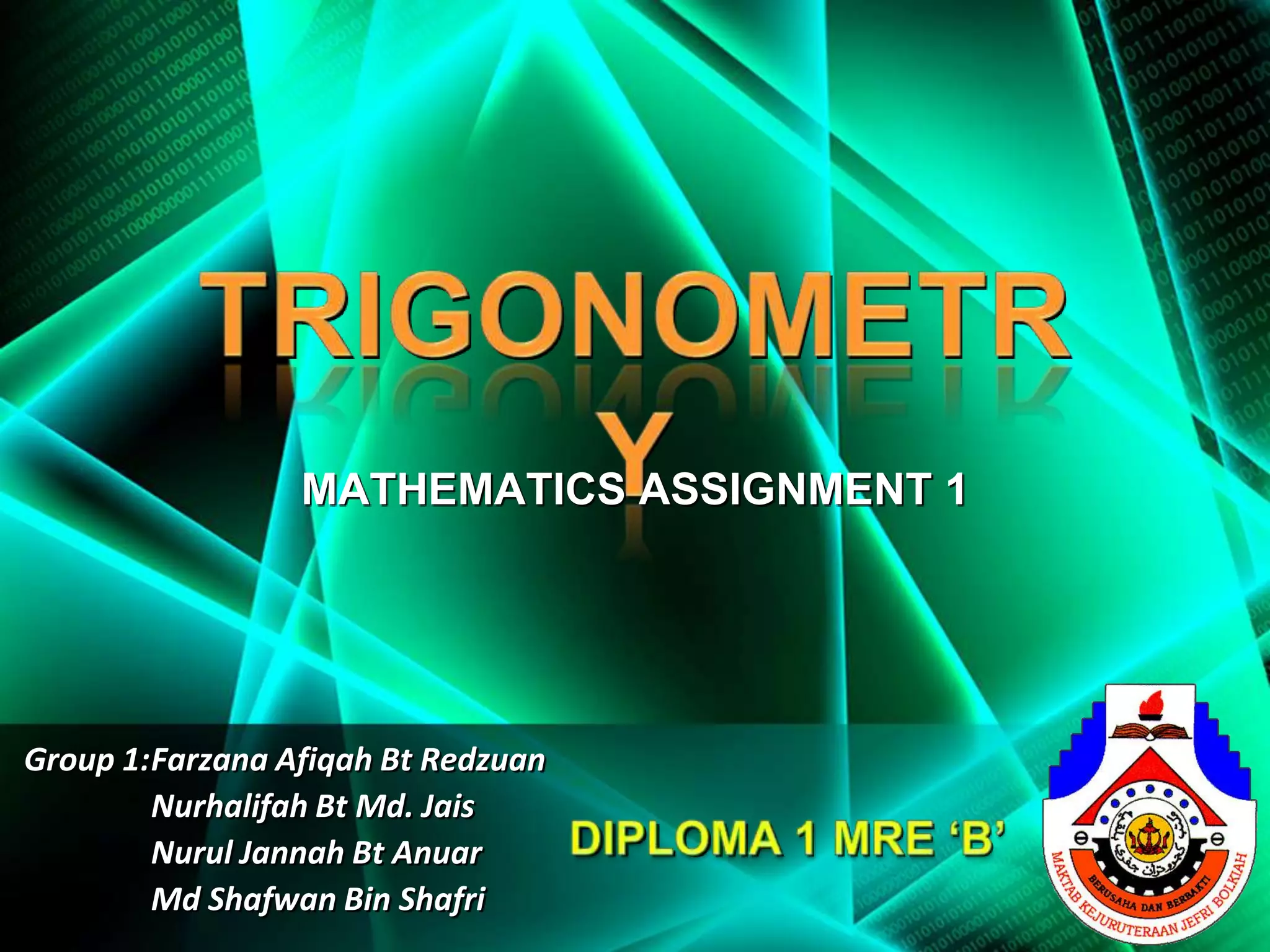 This mathematics assignment applies trigonometry to measure the heights of real-life structures. [1] Students measured the body heights of four classmates, the angles of elevation to view the top of structures, and the distances between the observer and structures. [2] Using trigonometric functions like tangent, the students calculated the heights of the structures. [3] Trigonometry allows heights to be determined for objects too tall to directly measure with a ruler.