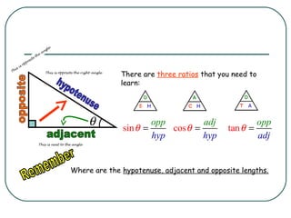 This document discusses trigonometric ratios and solving trigonometric equations. It provides the definitions of sine, cosine, and tangent ratios relating the opposite, adjacent, and hypotenuse sides of a right triangle. An example problem is worked through to solve for the unknown side of a triangle using the sine ratio, substituting known values and rearranging the equation by multiplying both sides by the variable. A second example is presented using the tangent ratio to solve another trigonometric equation for the unknown side.