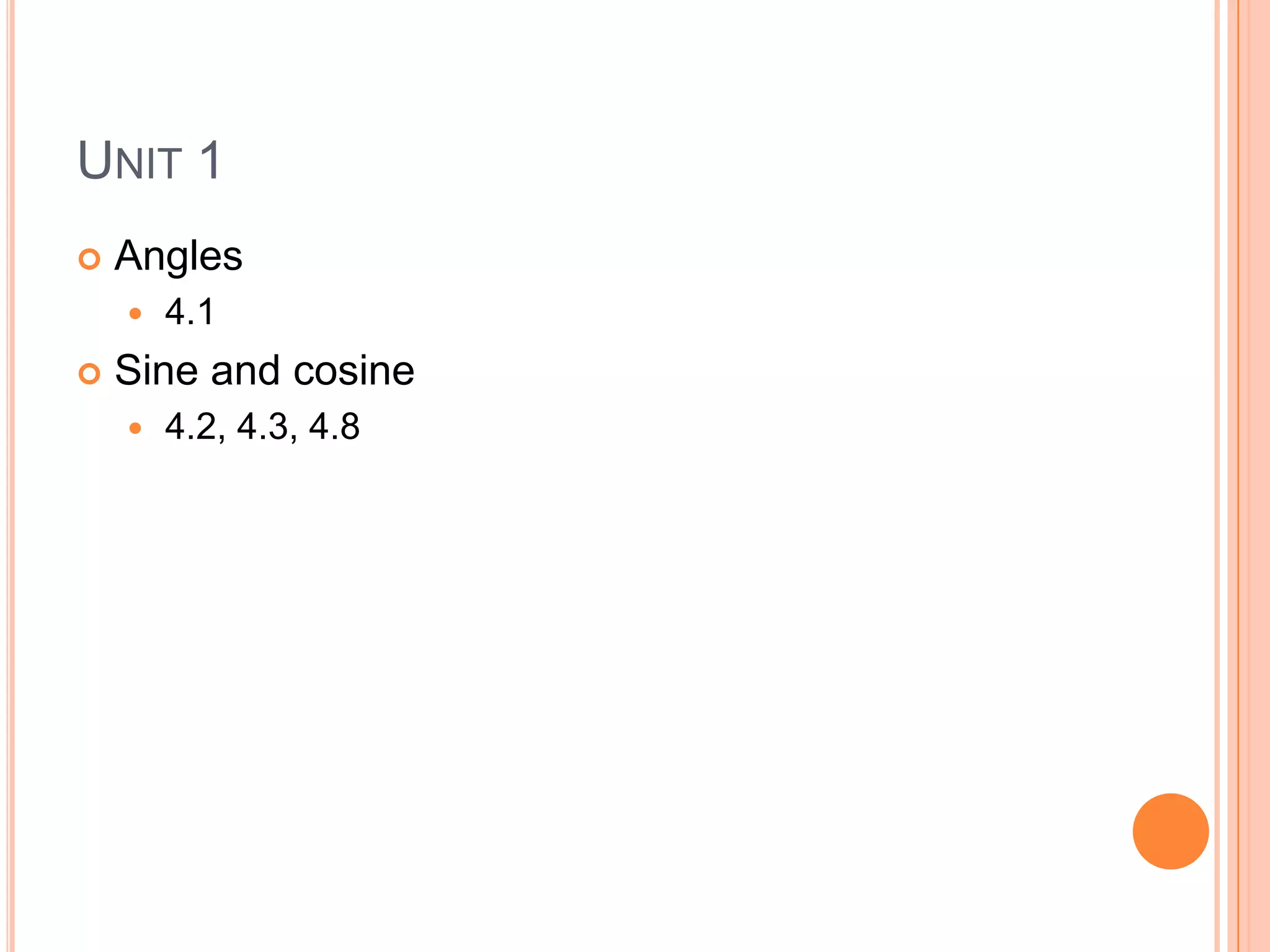 Unit 1 covers measuring angles in degrees and radians, converting between the two systems, graphing trig functions, and using trig functions to solve right triangles.