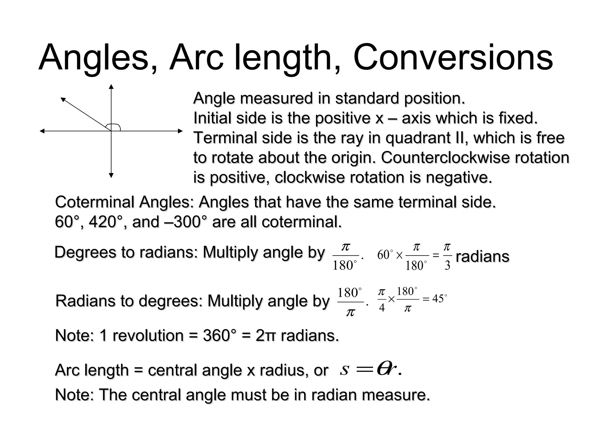 The document provides an overview of trigonometry, including angle measurement, conversions between degrees and radians, arc length, and the definitions of trigonometric functions. It details basic trigonometric identities, graphs of sine, cosine, tangent, and their corresponding properties, as well as inverse trigonometric functions and vector operations. Additionally, it covers the law of sines and cosines, summarizing essential concepts and formulas used in trigonometry.