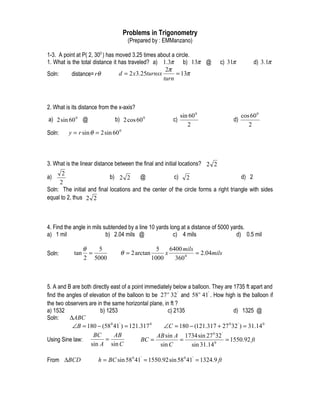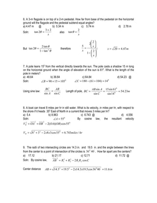 The document provides solutions to 22 trigonometry problems involving topics like distance traveled along a circle, distance between initial and final locations along a circle, angles subtended by lines, heights of balloons using trigonometric ratios, angles subtended by flagpoles and pedestals, lengths of poles, velocities of boats factoring currents, distances between circle centers, angles of inclination of hills, distances between ships traveling at different velocities and directions, trigonometric identities, and solving for unknowns in trigonometric equations. The final problem uses the law of cosines to solve for the length of side a of a spherical triangle given two angles and the opposite side.
