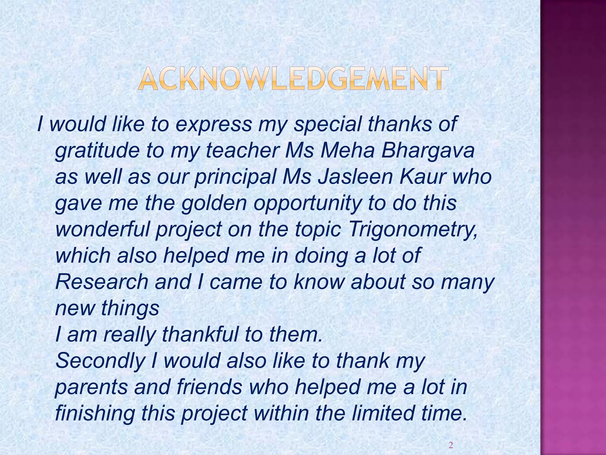 Kartikeya Pandey thanks his teacher Ms. Meha Bhargava and principal Ms. Jasleen Kaur for allowing him to complete a project on trigonometry. He also thanks his parents and friends for their help. The document then provides information on trigonometry including its origins in ancient mathematics, definitions of key terms like sine, cosine, and tangent. It also discusses right triangles, angle measurement in degrees and radians, trigonometric functions, trigonometric identities, and applications of trigonometry.