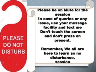 This document discusses phonics and trigraphs, and provides instructions for an online session, asking participants to mute themselves, use the message function for questions, avoid touching screens or interacting with the presentation, and remain quiet to avoid disturbances while learning.