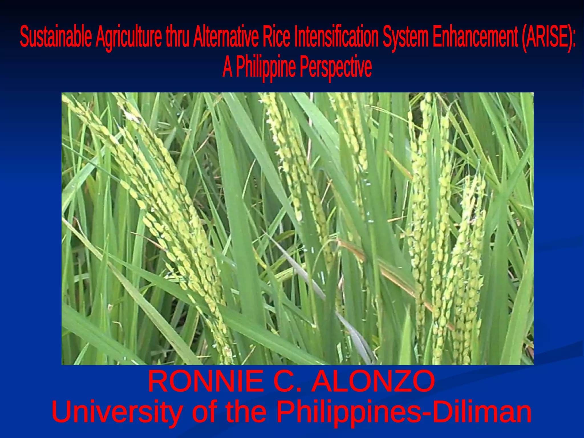 ARISE (Alternative Rice Intensification System Enhancement) is a farming method developed in the Philippines to increase rice yields while reducing dependence on chemicals. It combines five practices: proper seed selection, thorough land preparation, soil nutrient management, integrated pest management, and water management. The goal is to increase farmer yields by 10-35% using organic methods, lower production costs, and improve farmer livelihoods. Key components include wider spacing of plants, application of Trigrow organic fertilizer to promote robust roots and tillering, and mechanical weeding. Field tests showed ARISE crops had more tillers and were healthier than those grown with traditional methods.