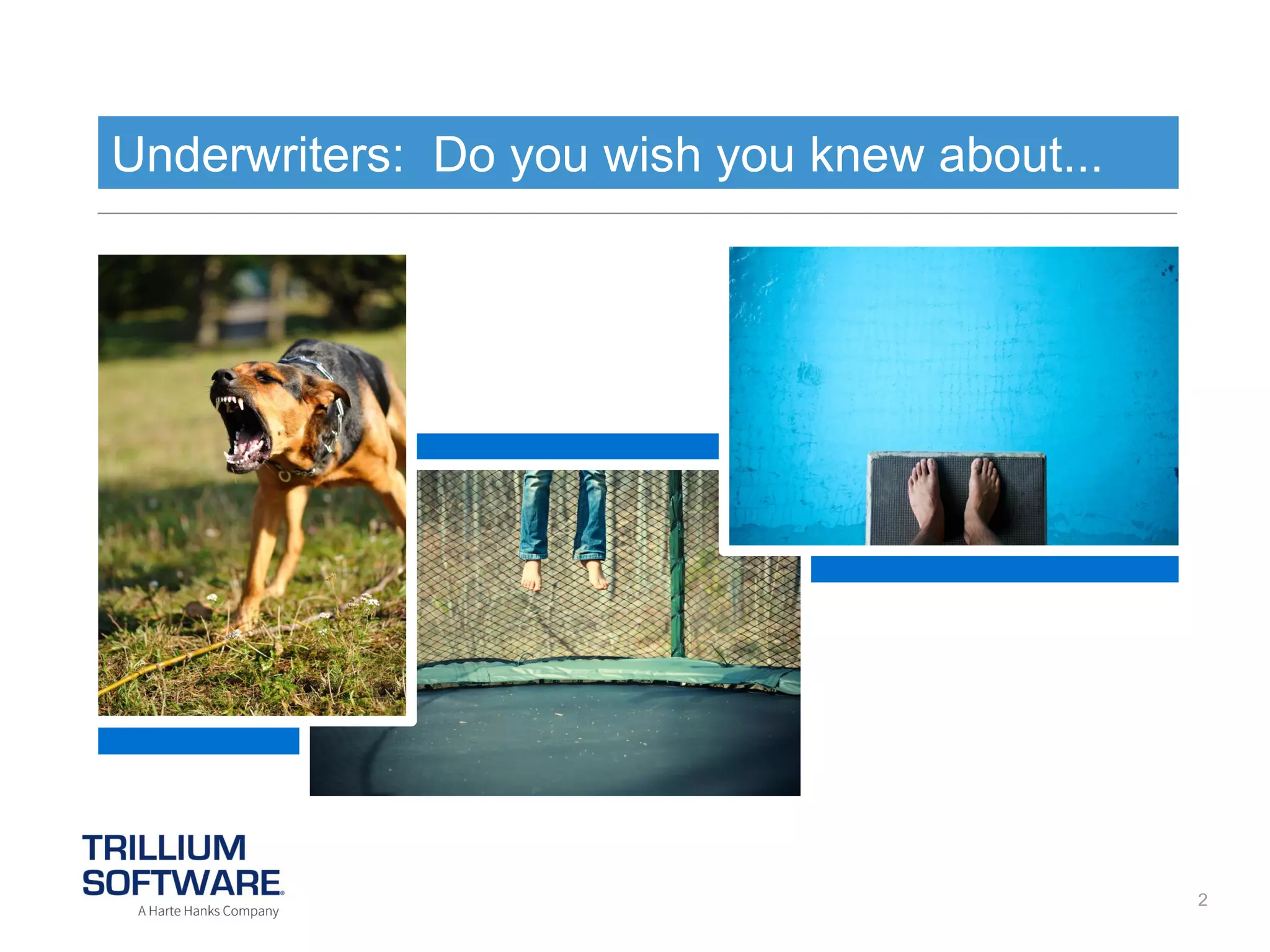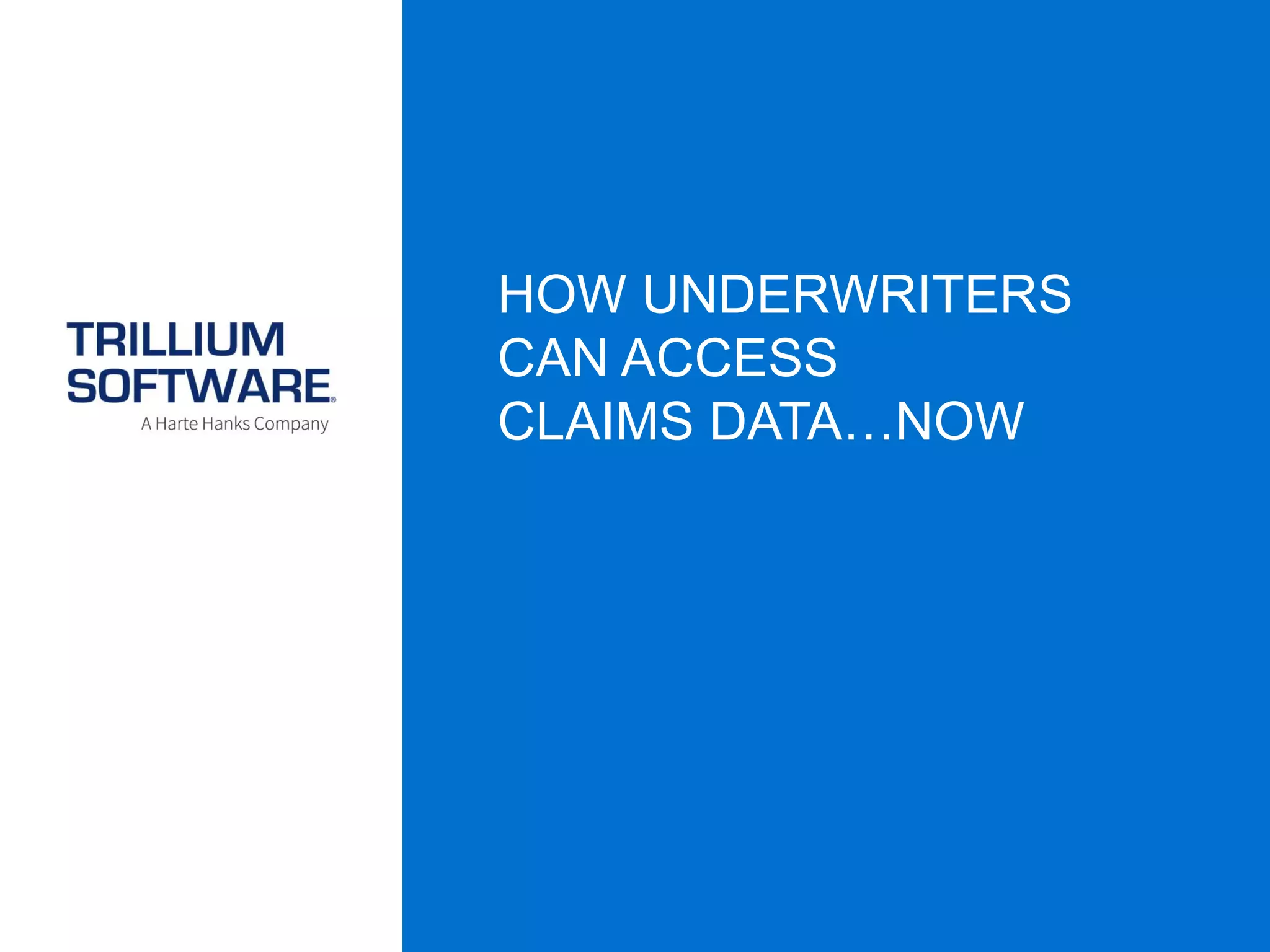Trillium software analyzes unstructured text and scanned documents in insurance claims files to identify valuable risk indicators for underwriters. The software extracts information from free form text in claims adjuster notes and correlates it with scanned documents. It then notifies underwriters of potential non-renewals, premium increases, or higher risks so they can make more informed underwriting decisions.