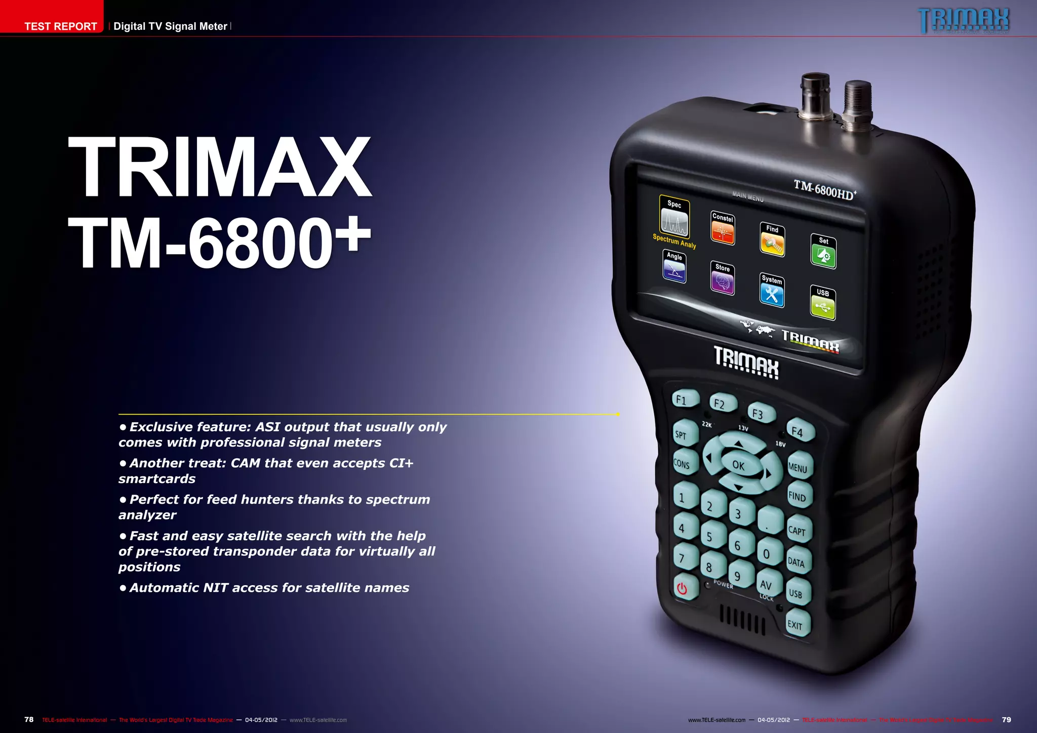 The document tests and reviews the Trimax TM-6800+ digital TV signal meter. It found the meter to be small and easy to operate with one hand. It has professional features like an ASI output and accepts CI+ smartcards. The meter quickly locks onto signals and displays useful information like signal quality metrics and satellite name. It can store settings and test results on an external USB drive. The reviewer was able to reliably receive a satellite channel using a 60cm antenna that normally requires a 120cm antenna.
