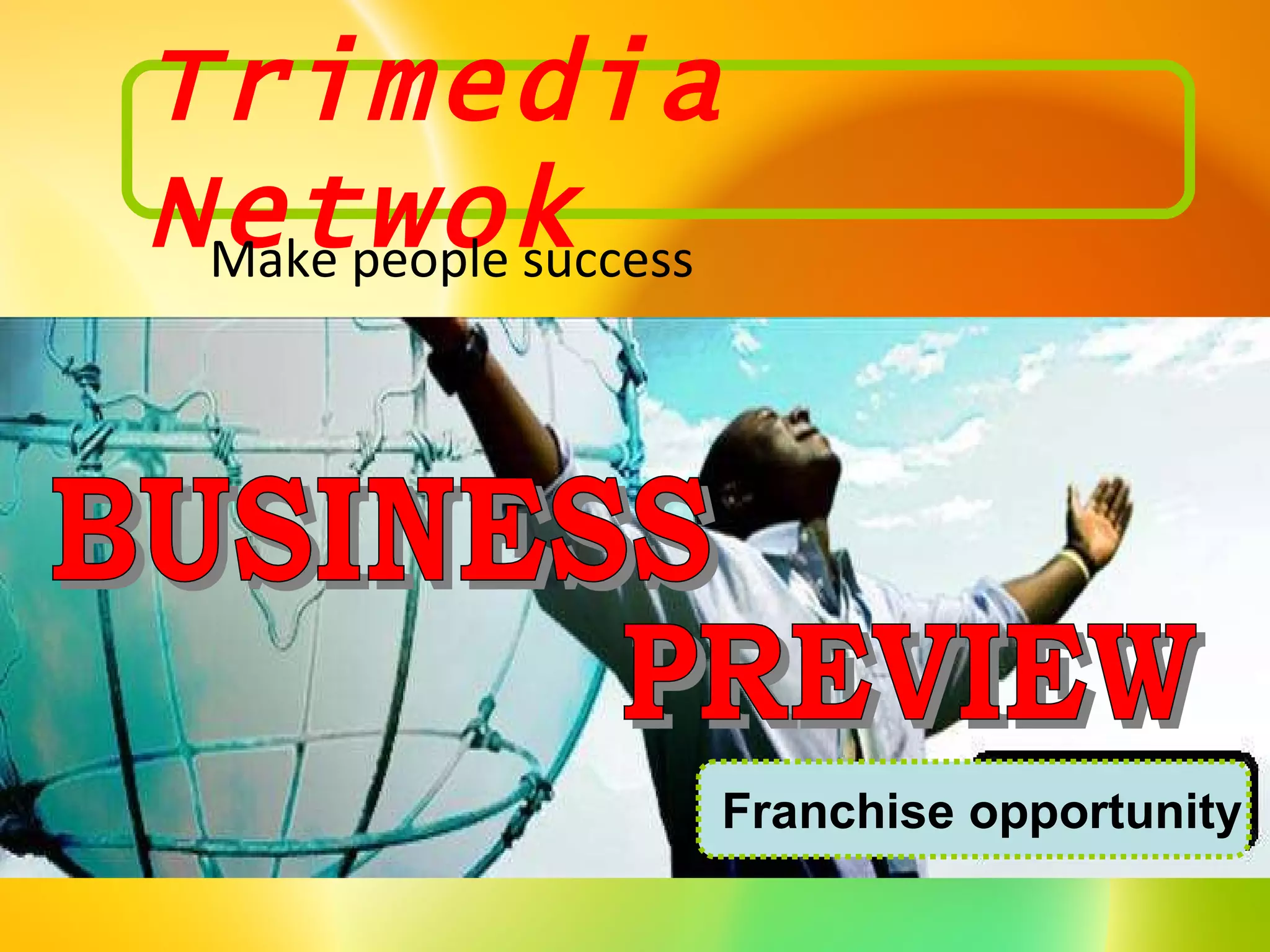 Dokumen tersebut menawarkan kesempatan bisnis waralaba jaringan Trimedia Network yang menjual emas sebagai produk utama. Terdapat berbagai paket keanggotaan dengan harga bervariasi dan bonus yang menarik seperti bonus sponsor, level, pasangan, titik, serta reward prestasi berupa emas, mobil, atau uang tunai jika memenuhi syarat tertentu. Investasi emas dianggap menarik karena nilai yang stabil, tidak terpengaruh inflasi, serta mudah dijual kemb