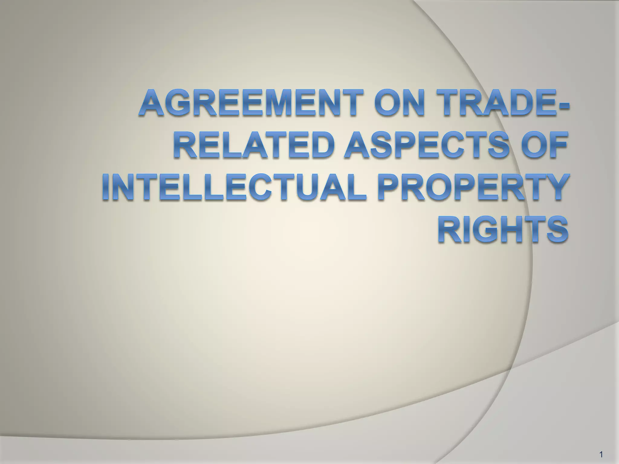 The document discusses the TRIPS agreement which introduced intellectual property rules into the multilateral trading system. It establishes minimum standards of protection that countries must provide for copyrights, trademarks, geographical indications, industrial designs, patents, trade secrets, and enforcement. The agreement aims to balance long term benefits of intellectual property with possible short term costs to society through exceptions. It covers issues like adequate protection of IP rights, enforcement within countries, settling disputes, and transitional arrangements for implementing new standards.