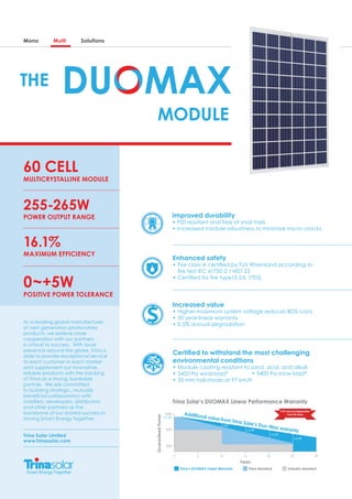 Trina Solar is a leading global manufacturer of photovoltaic products. They believe close cooperation with partners is critical to success. They are committed to building strategic partnerships to drive shared success. Their products include mono and multi solar modules that offer improved durability, enhanced safety, and increased value through a 30-year linear warranty.
