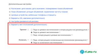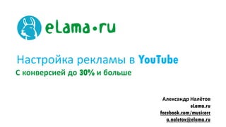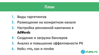 Документ описывает методы настройки рекламы на YouTube с возможностью достижения конверсии до 30%. Основные темы включают виды таргетинга, анализ эффективности рекламных кампаний и создание баннеров, а также предоставляются примеры и инструкции по запуску кампаний. Упоминается возможность использовать как ключевые слова, так и тематические каналы для максимизации результатов.