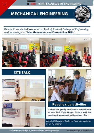 The document is a newsletter from Trinity College of Engineering providing updates on various events and activities. It mentions a technical session on FEAST, pending B.Tech results, a workshop on idea generation and presentation skills, robotic club activities with projects ending this month, a talk on systems in an IC engine, mechanical students in a production lab, visits to a science museum and planetarium, the volleyball team receiving a walkover in their first round and practicing for their next round. It also lists the department editors.