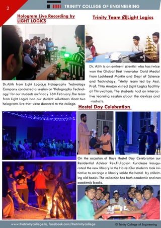 This document summarizes events at Trinity College of Engineering. It describes the inauguration of a new library inside the student hostel, where students collected old books. It also discusses a session conducted by Dr. Ajith from Light Logics on holography technology, where the company live recorded two holograms for the college. Students visited Light Logics facility led by Assistant Professor Titto Anujan for an interactive learning session about holography devices and products.
