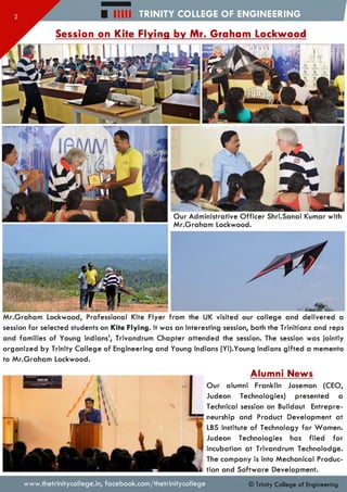 Trinity College of Engineering was selected as one of 12 nodal colleges in Kerala to conduct workshops and internships approved by AICTE. The internship program is supported by the Government of Kerala and organized by training company Fourth Ambit. Trinity impressed Fourth Ambit representatives with its hands-on education and entrepreneurship focus. The program includes online tests for second and third year students starting February 27th. The college also held a 3DS Max workshop and a kite flying session by a professional UK kite flyer. An alumni presented an entrepreneurship talk at another college and his company is being incubated locally.