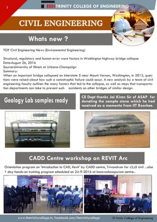 The document provides updates from the Civil Engineering department at Trinity College of Engineering. It summarizes a study on the factors that led to a 2013 highway bridge collapse in Washington state, including structural, regulatory and human errors. It also announces upcoming workshops on CAD and Revit software, awareness training for a "Green Home" energy efficiency contest, and a campus visit from the founder of Suprajiv Foundation to discuss potential certification programs in engineering fields.