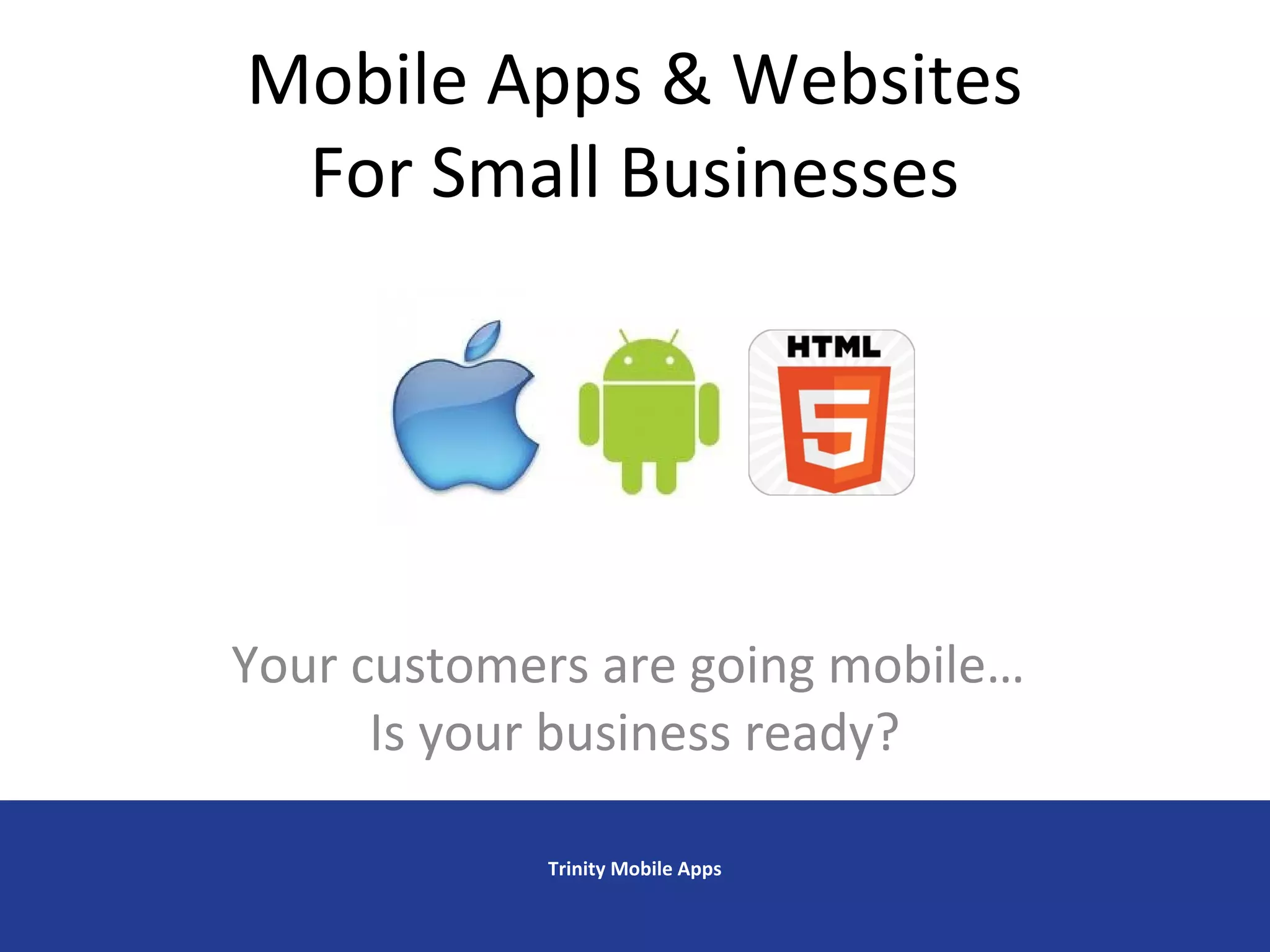 The document discusses the importance of mobile applications and optimized websites for small businesses to engage customers in a mobile-driven market. It outlines key mobile marketing strategies, statistics on consumer behavior, and emphasizes the significant impact of mobile platforms on business growth. Trinity Mobile Apps provides tailored solutions for creating mobile-friendly experiences to attract and retain customers.