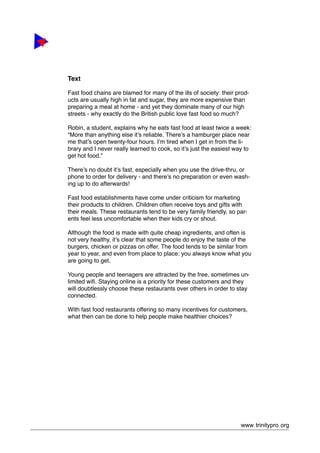 The document discusses fast food restaurants and why they are popular despite criticisms of their products. It provides perspectives from a student who eats fast food twice a week for its reliability and convenience. While fast food can be prepared and eaten quickly without cleanup, it is often high in fat and sugar. Fast food chains also market aggressively to children through toys and gifts. However, people enjoy the consistent taste offered at such restaurants, and their wifi access draws younger customers who prioritize staying connected. The document questions what can be done to help people make healthier choices.