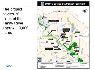 The Trinity River Corridor Project covers 20 miles of the Trinity River and 10,000 acres, with the primary objective of flood protection. It also aims to improve environmental restoration, recreation, transportation, and community/economic development. Major components include constructing levees, wetlands, and interior drainage systems to protect against 100-year and 800-year floods. Many recreation components are also underway like trails, parks, and an urban lake. The transportation plan includes the Trinity Parkway toll road and upgrades to S.M. Wright Parkway.