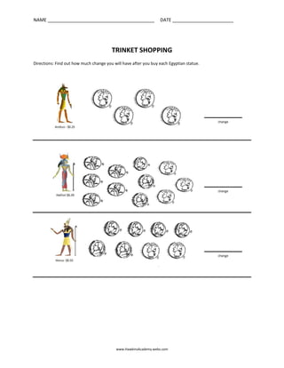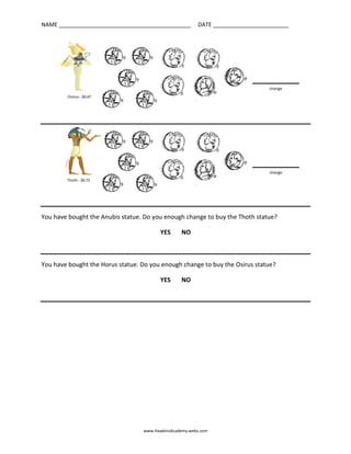 The document provides instructions to determine if there is enough change after buying Egyptian statues from a trinket shop. It asks if there is enough change to buy a Thoth statue after an Anubis statue, and enough for an Osirus statue after a Horus statue.